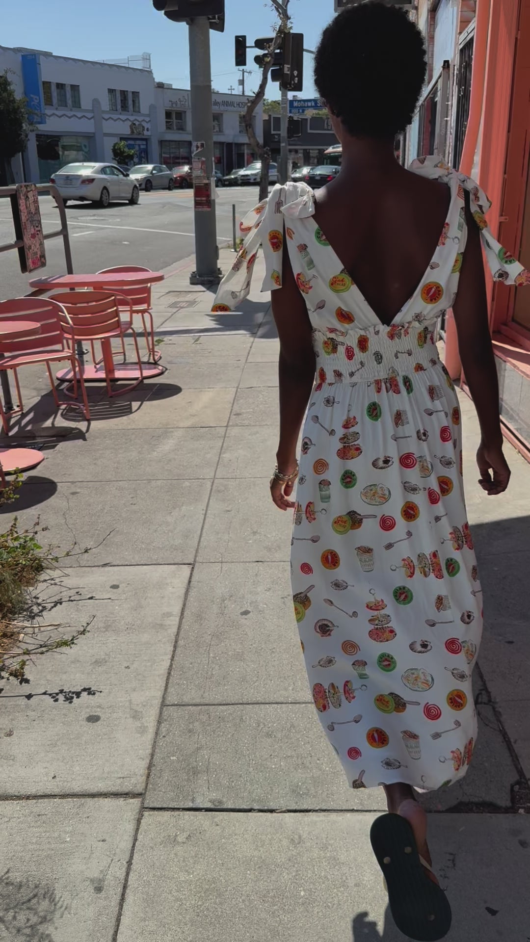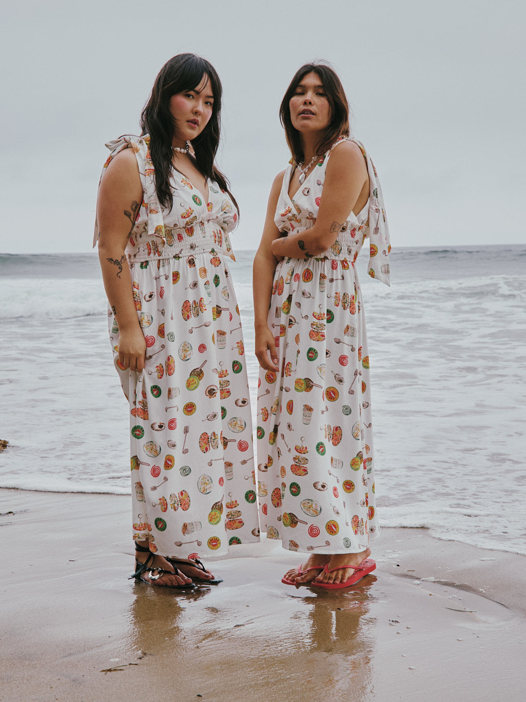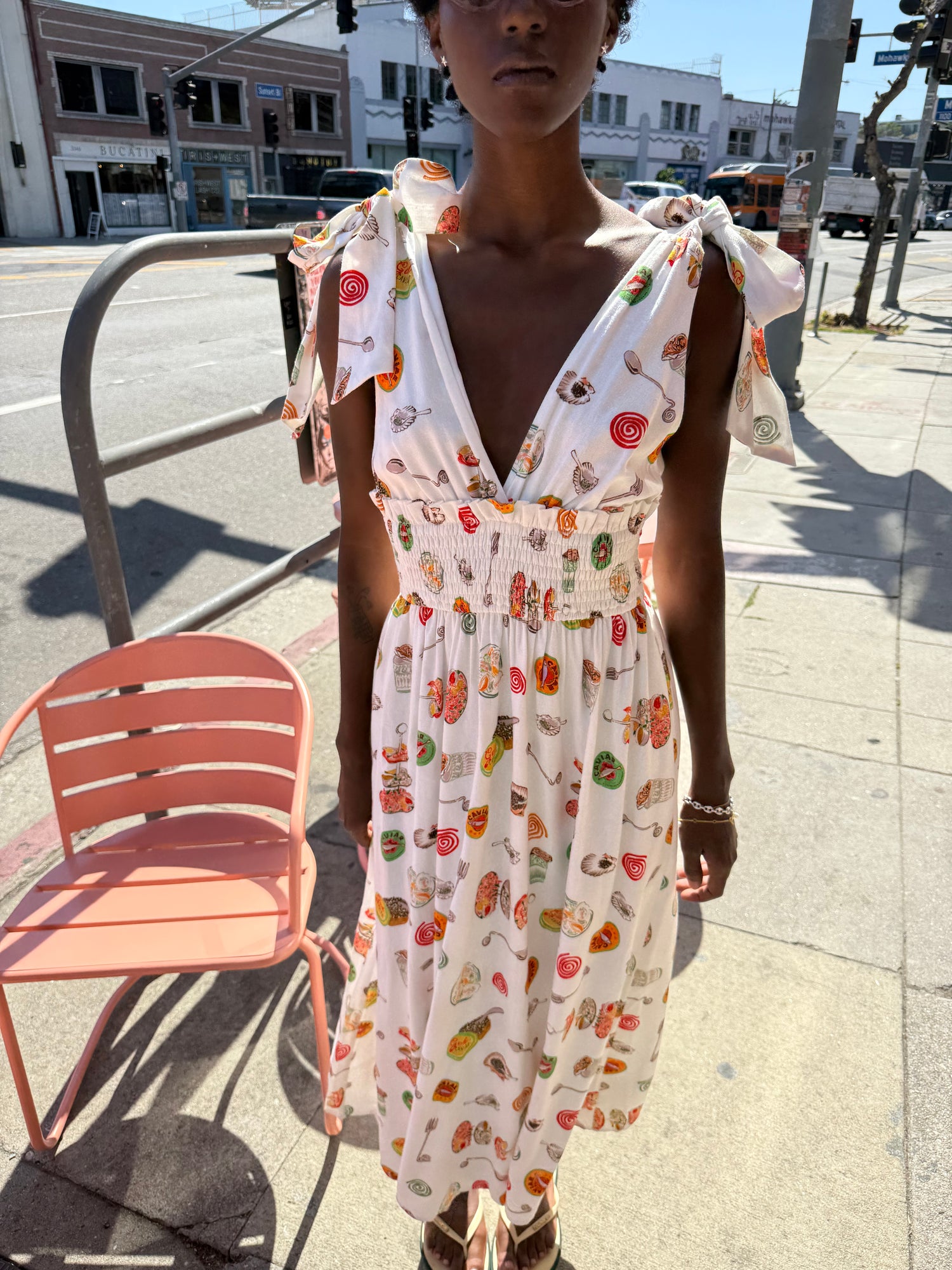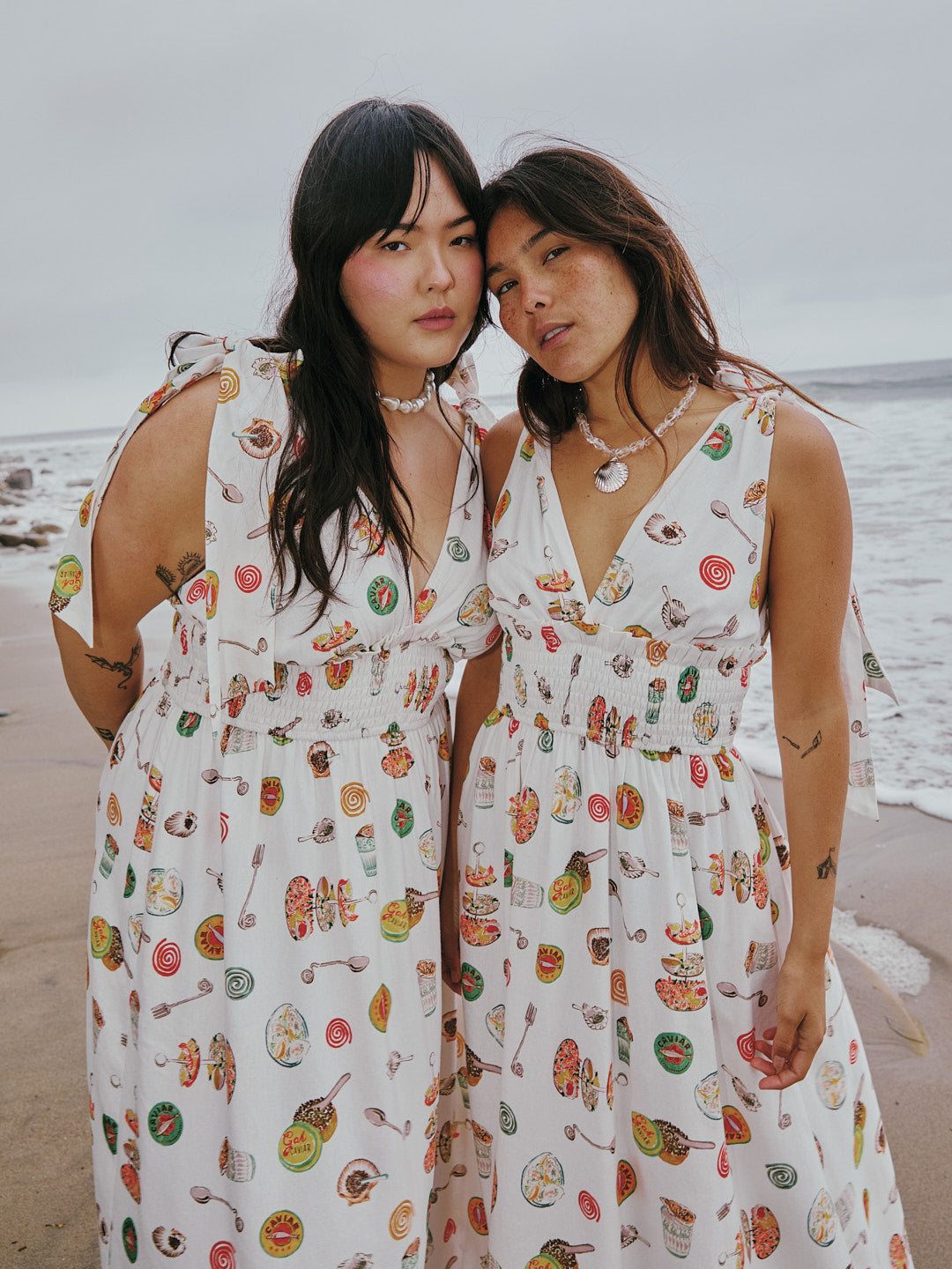 Lightweight linen blend midi dress featured in our signature Caviar Dreams print. This dress has a plunge neckline with adjustable tie straps and an elasticized smocked waist for a comfortable fit.