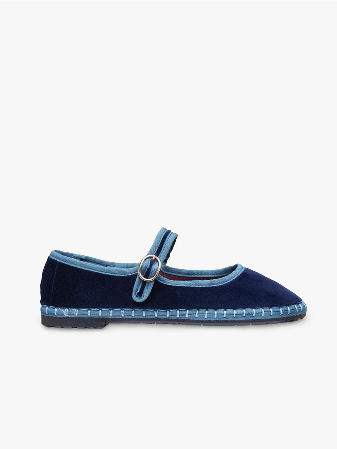 Introducing the Montague flat from Spanish label, Flabelus: This velvet ballerina flat features a v-opening in blue with light blue piping. Laced with a strap made from velvet and features a buckle closure. The outside of the shoe is 100% cotton velvet, and the inside of the shoe is 100% organic cotton with anti-bacterial treatment. The sole is made of rubber produced from recycled bicycle tires.