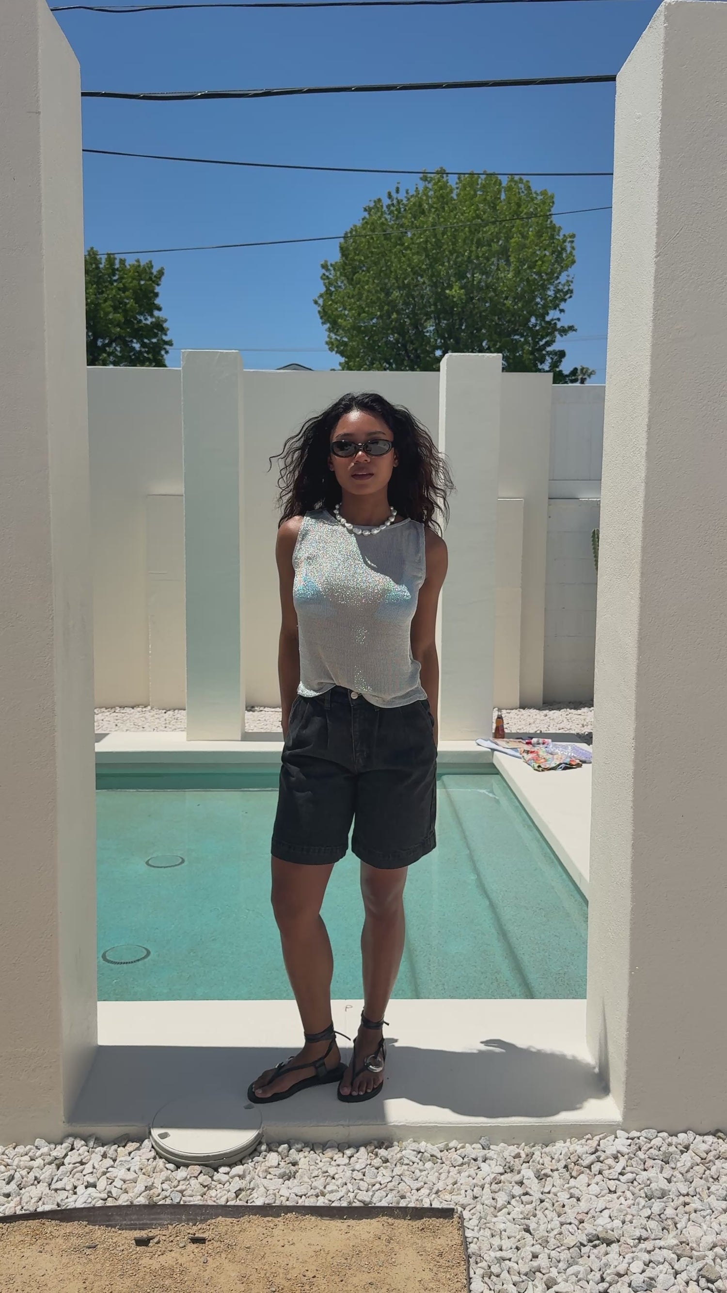 Sheer tank featured in a super soft metallic mesh fabric made for the summer breeze.