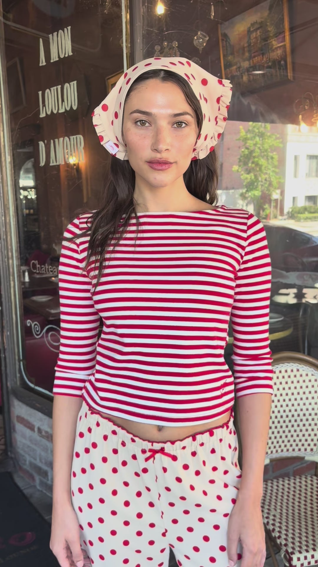 Introducing Le Petit Dot: Dots, stripes, and silhouettes made for the season in-between. The Nia Top in our signature Scarlett Stripe print is a true staple for any wardrobe. This cotton blend 3/4 sleeve tee has a boxy, cropped silhouette. Made to have a vintage-feel. Featuring our signature Gah! embroidery at the bottom hem.