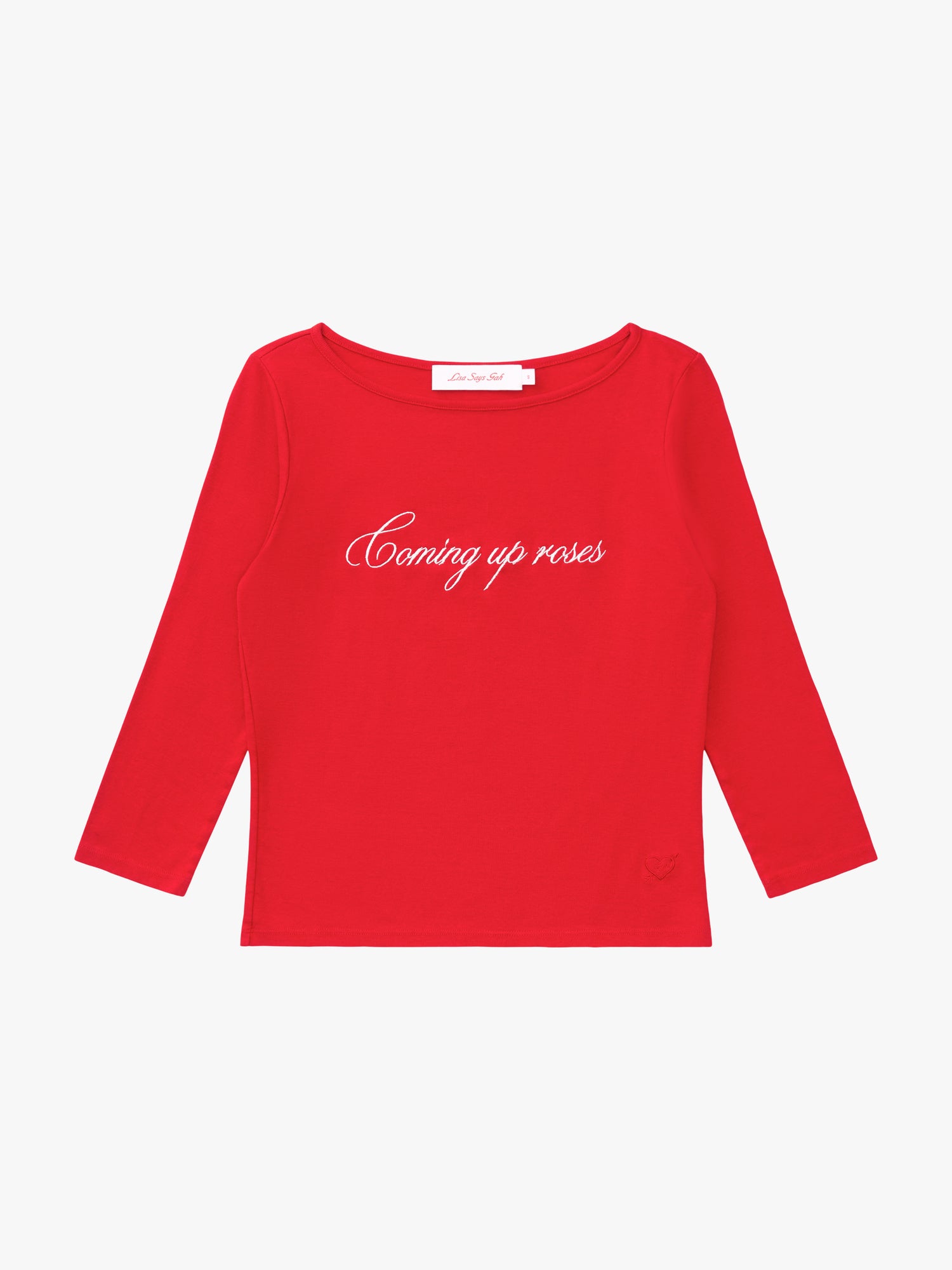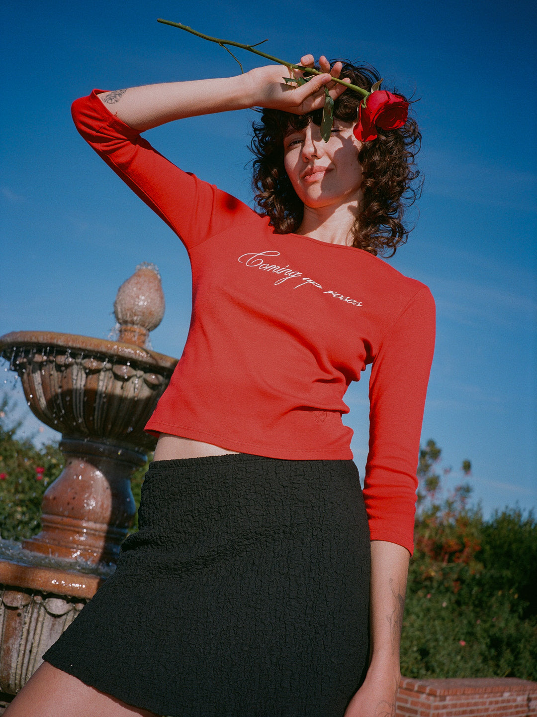 The Nia Top in a classic bright red, featuring a white "Coming Up Roses" embroidery, will become your winter staple. This cotton blend 3/4 sleeve tee has a boxy, cropped silhouette. Made to have a vintage-feel. Featuring our signature Gah! embroidery at the bottom hem.