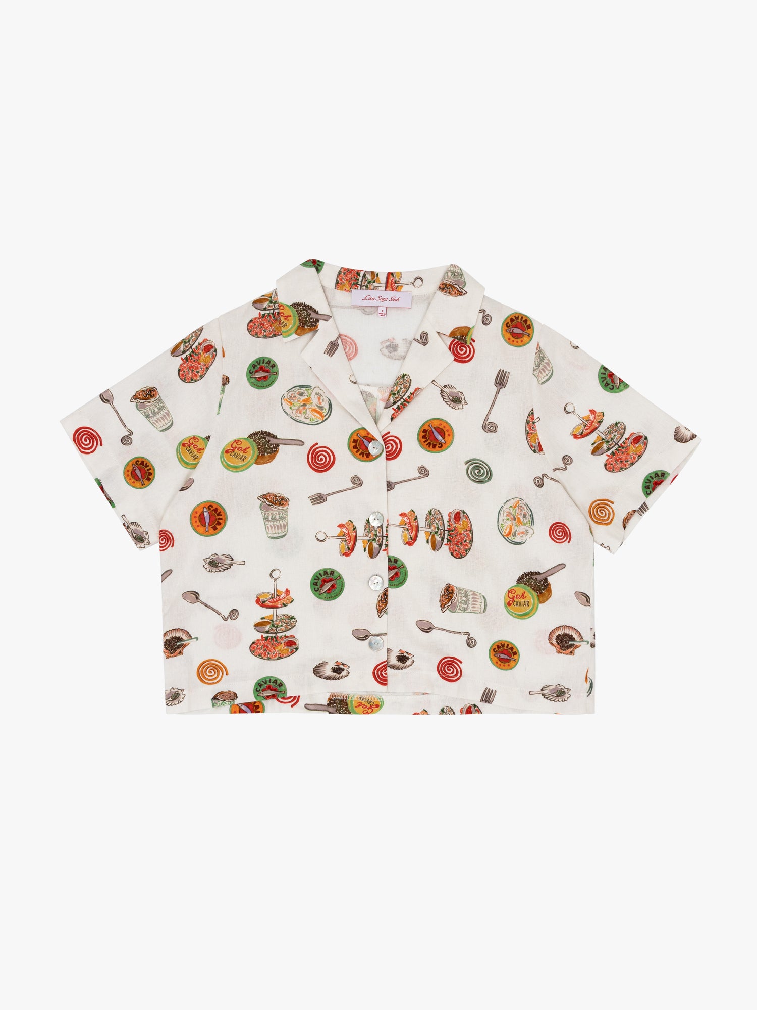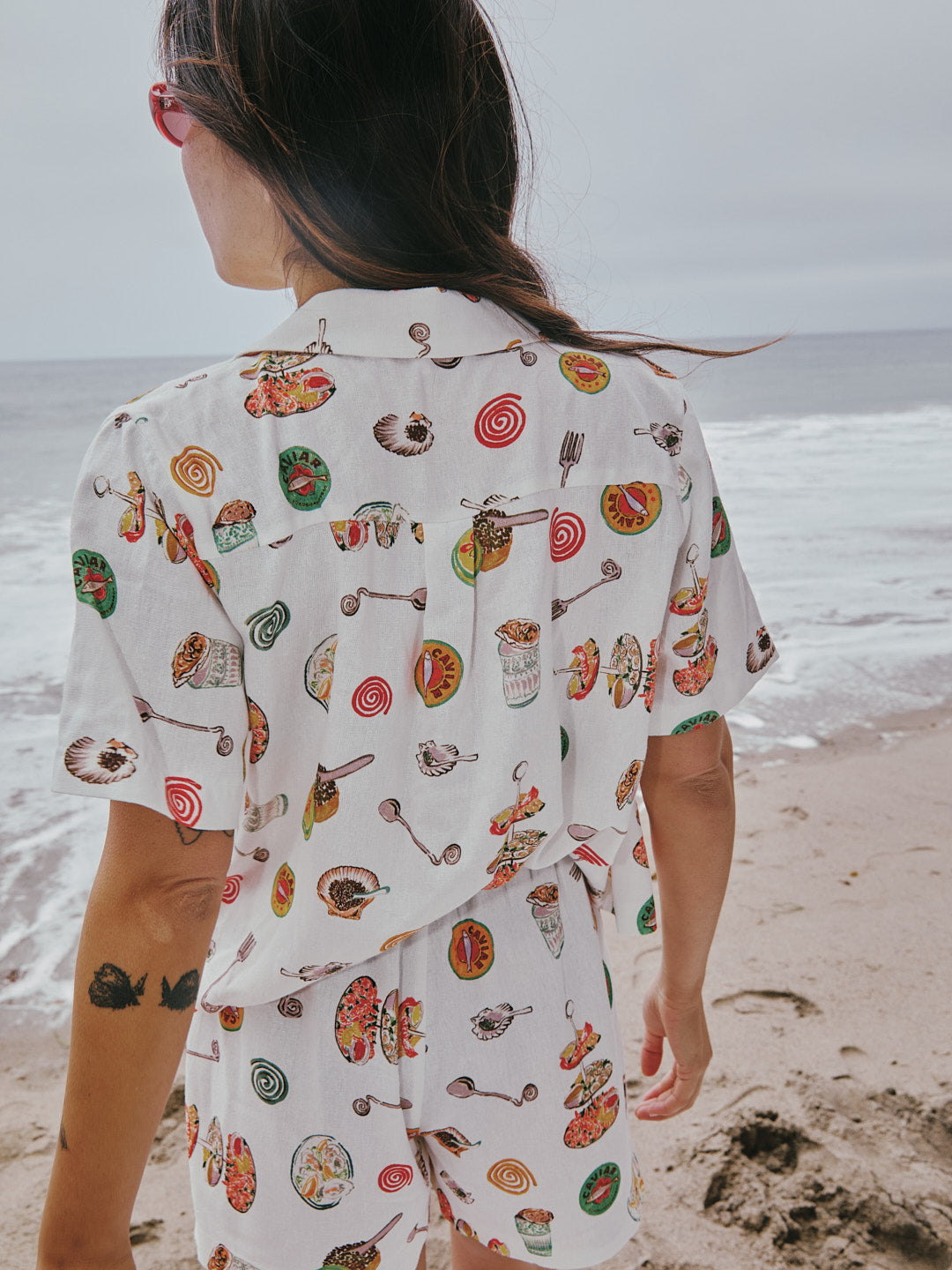 This is a short sleeve button-up top featured in a lightweight linen blend in our signature Caviar Dreams print.