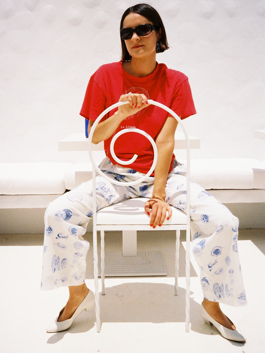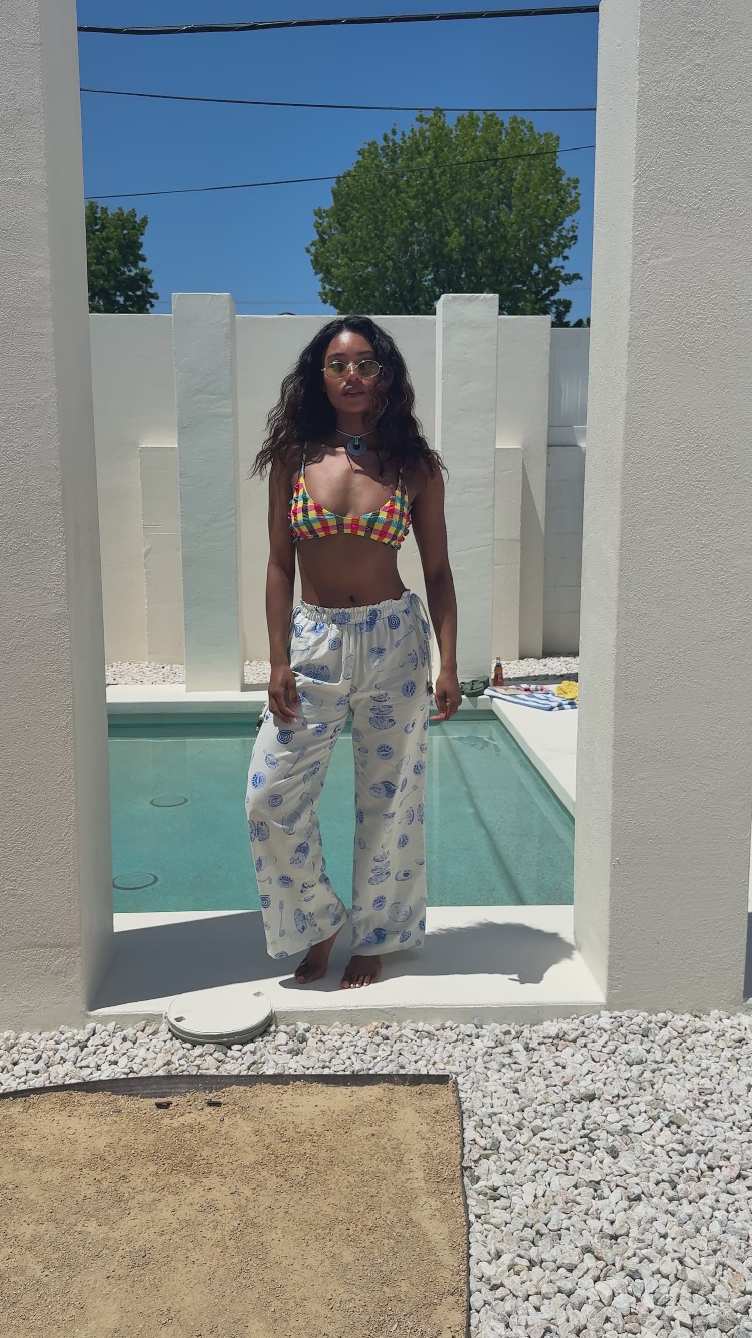 White linen blend pants in our signature Caviar Dreams Blue print, featuring an elastic waistband. Decorative and functional ties at each hip.