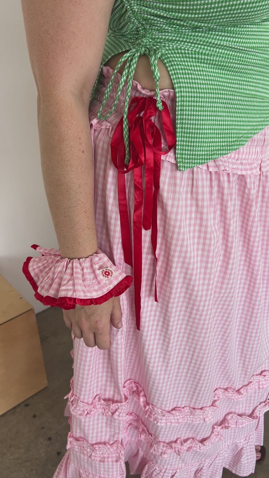 A dramatic pink gingham cotton maxi skirt with an adjustable elastic high waistband with red satin ribbon and ruffle trim. Unlined.