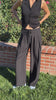Meet the Margo Pant: a wide-leg trouser in a black pinstripe fabric featuring a drawstring waist, pleats at the top and decorative back pockets for a classic look.