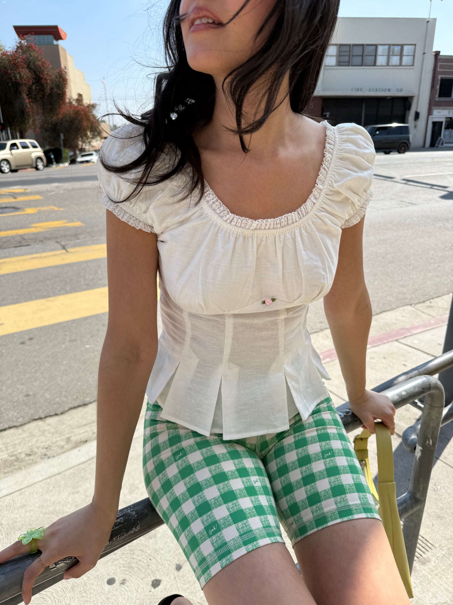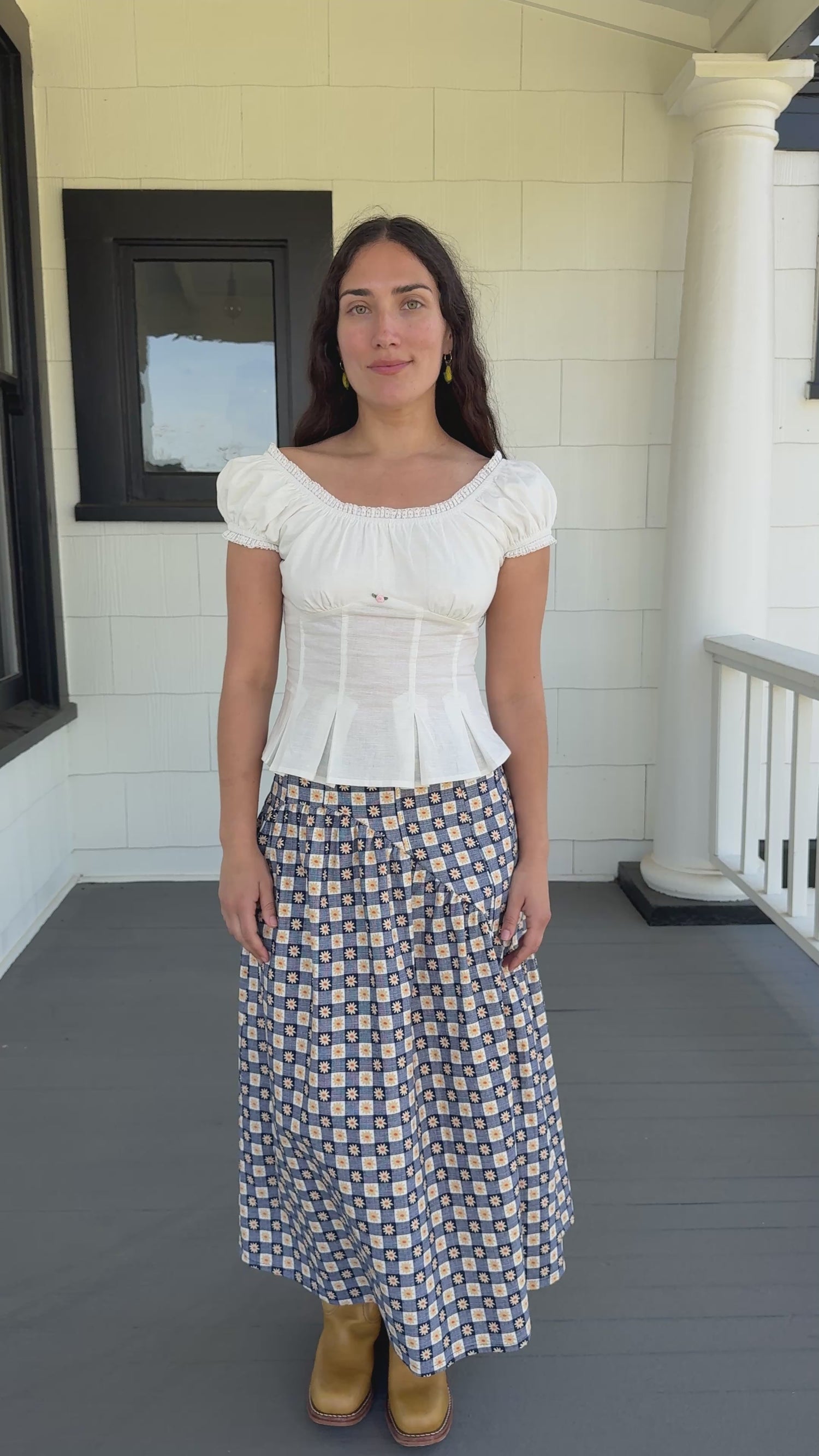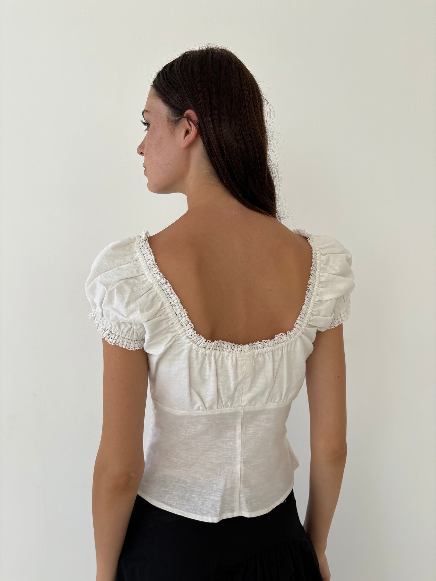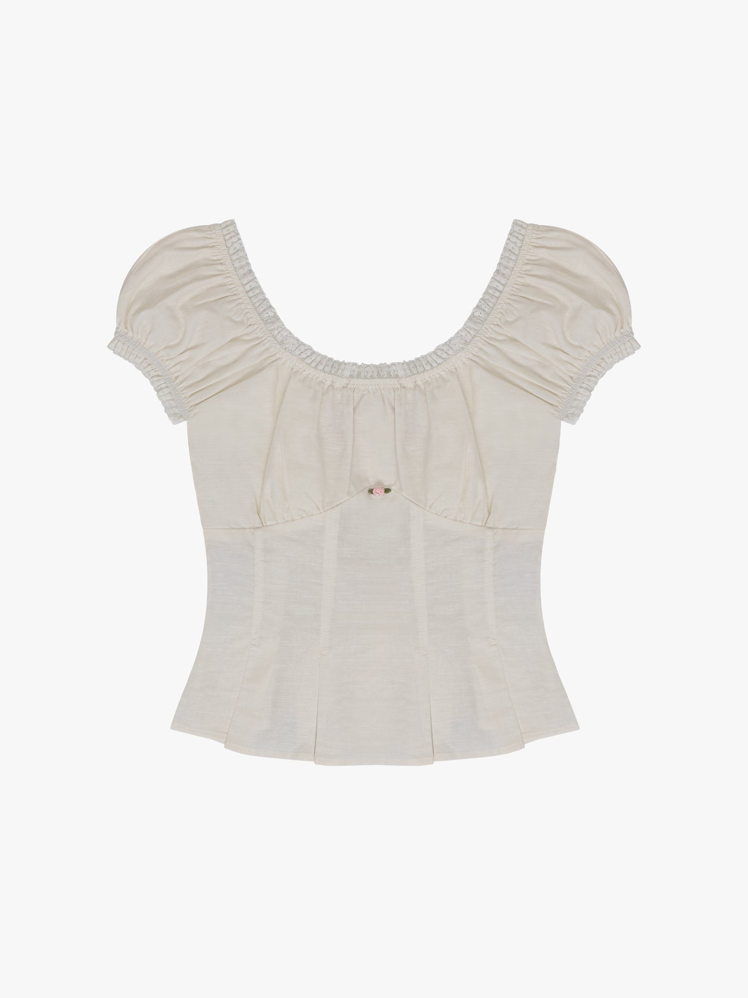 Cotton blend corset-style blouse with a sweet elasticized neckline and a ruched short sleeve for a puff-sleeve effect. This blouse has a flattering pleat at the bodice and a hidden zip closure at the side. This top runs a bit small. We suggest sizing up by 1 size.