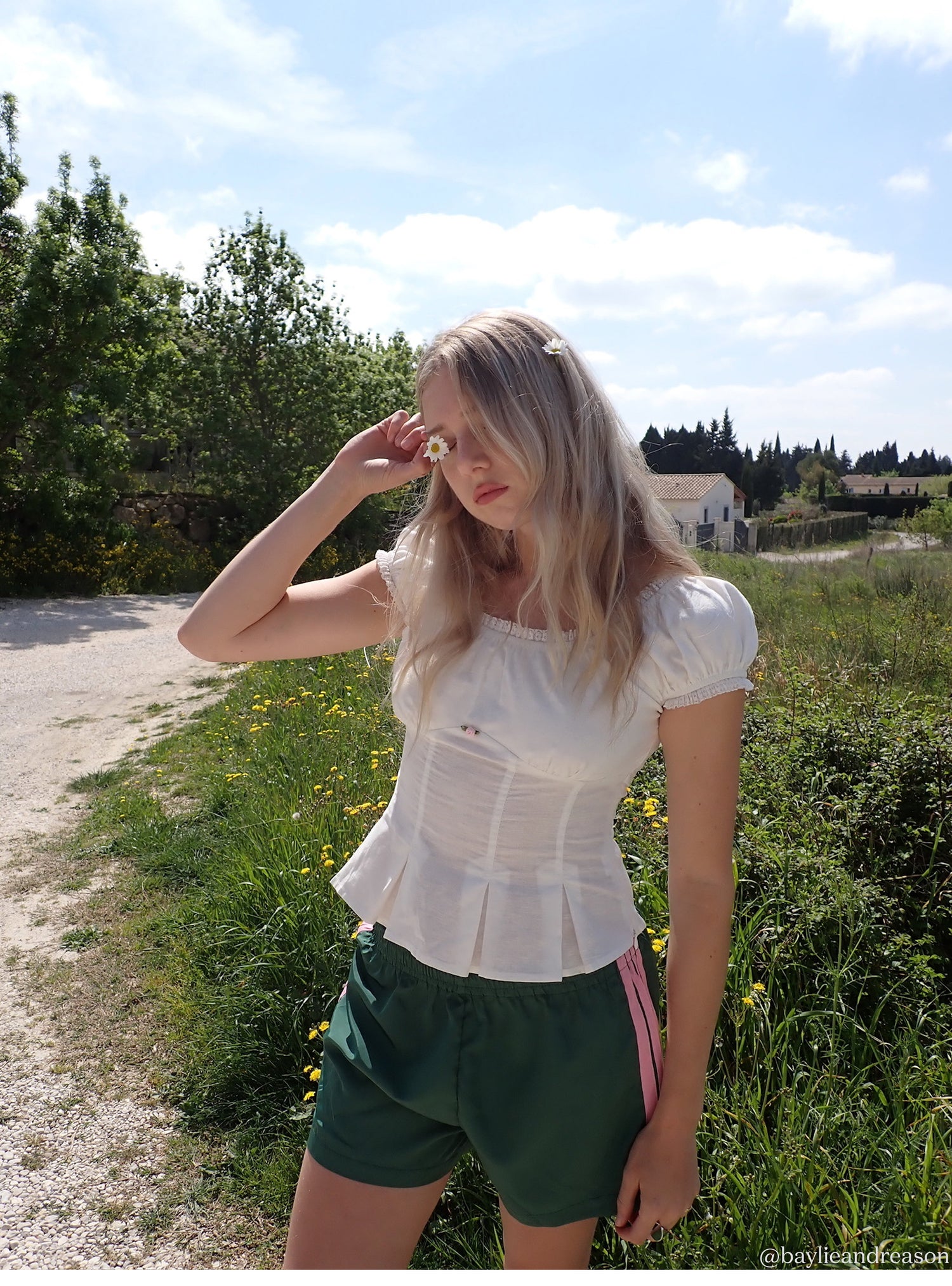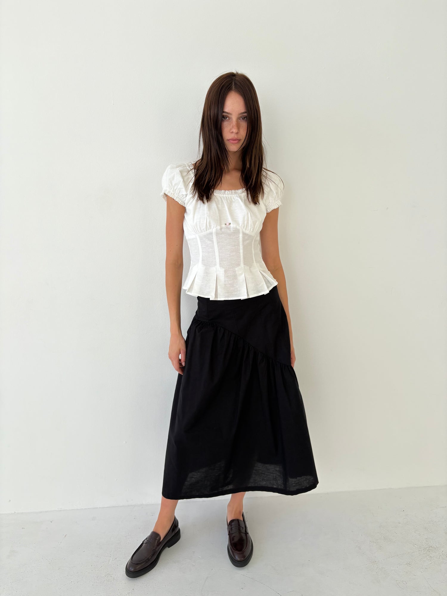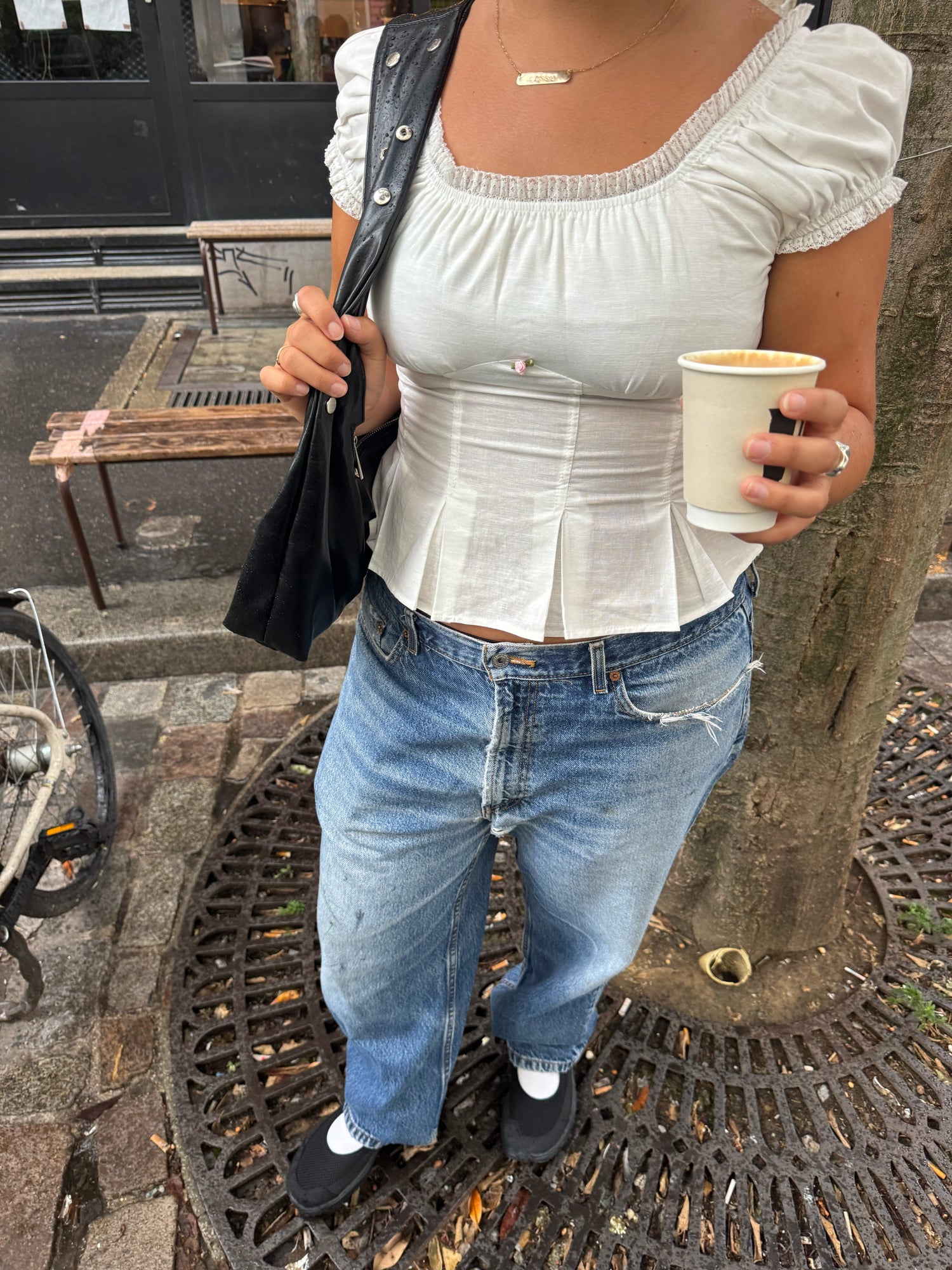 This top is so flattering and sweet. The fabric is cotton and linen and feels so breathable and high quality. The seams at the waist really cinch me in, but is still wearable. I got the L in the black because it fit perfect. There might be a slight variance in sizes between colors, because the white in L was a little tight in the arms.