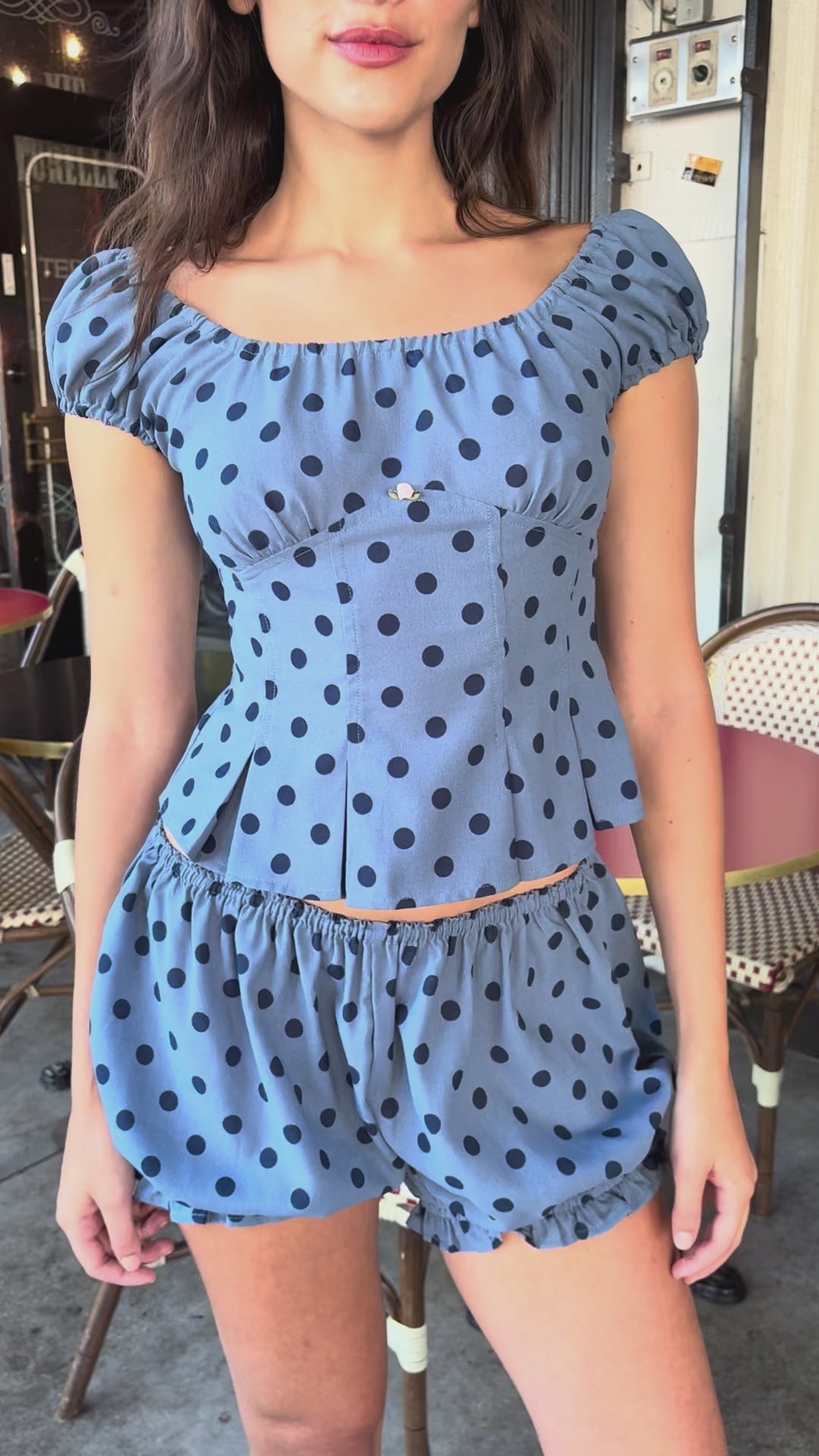 Introducing Le Petit Dot: A collection full of classic stripes and adorable dots! The Pat Top is a corset-style blouse with a sweet elasticized neckline and a ruched short sleeve for a puff-sleeve effect. This blouse has a flattering pleat at the bodice and a hidden zip closure at the side. Featured in our signature Oxford Dot print. This top runs a bit small. We suggest sizing up by 1 size.