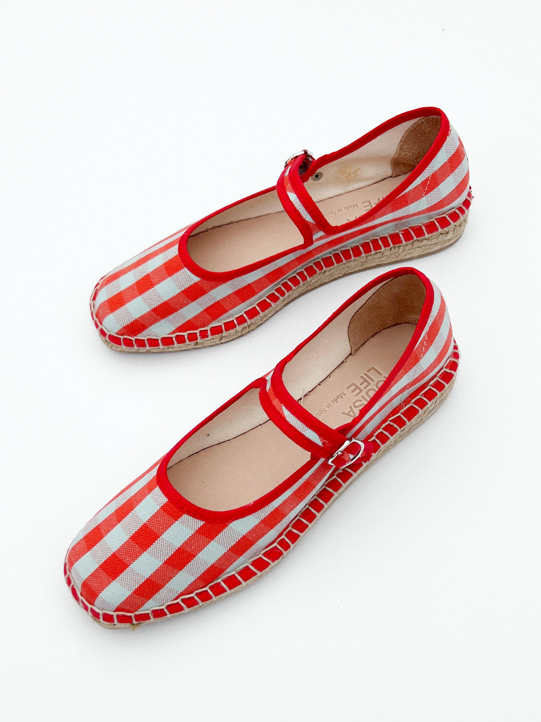 A fun and playful Mary-Jane style espadrille featuring a charming red and light blue gingham pattern.