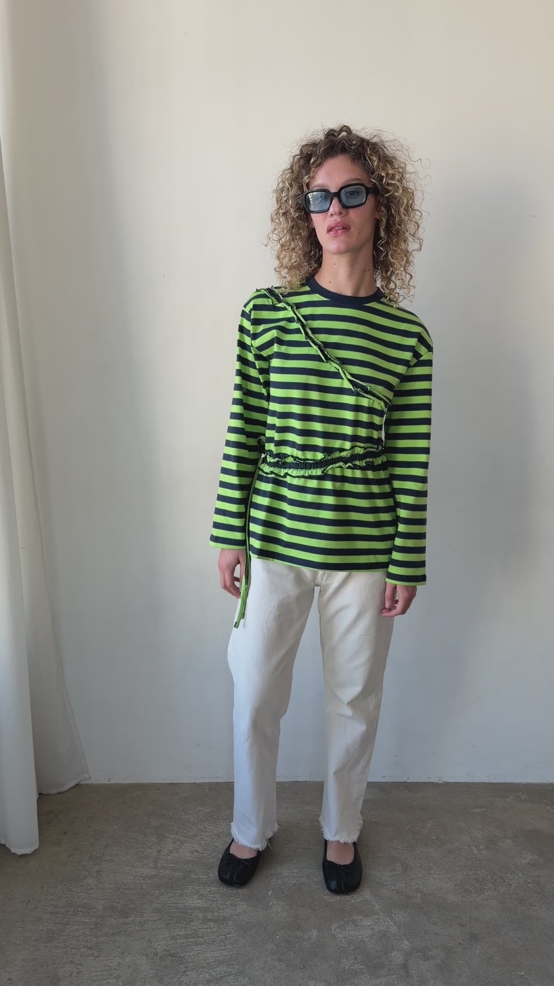 The Prudie Ruffle Long Sleeve Tee brings playful detailing to an easy, oversized silhouette. Designed in a yarn-dyed navy and lime stripe, it features soft self frill accents with adjustable ties to cinch and shape. Finished with a classic crew neck, navy rib trim and signature red DM embroidery at the back neck, it’s a statement tee made for everyday wear.