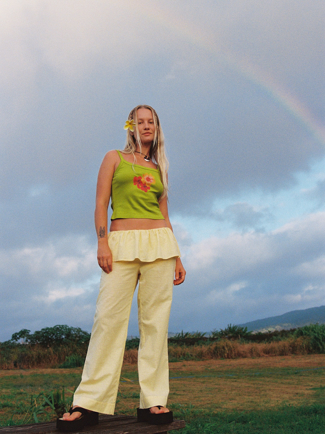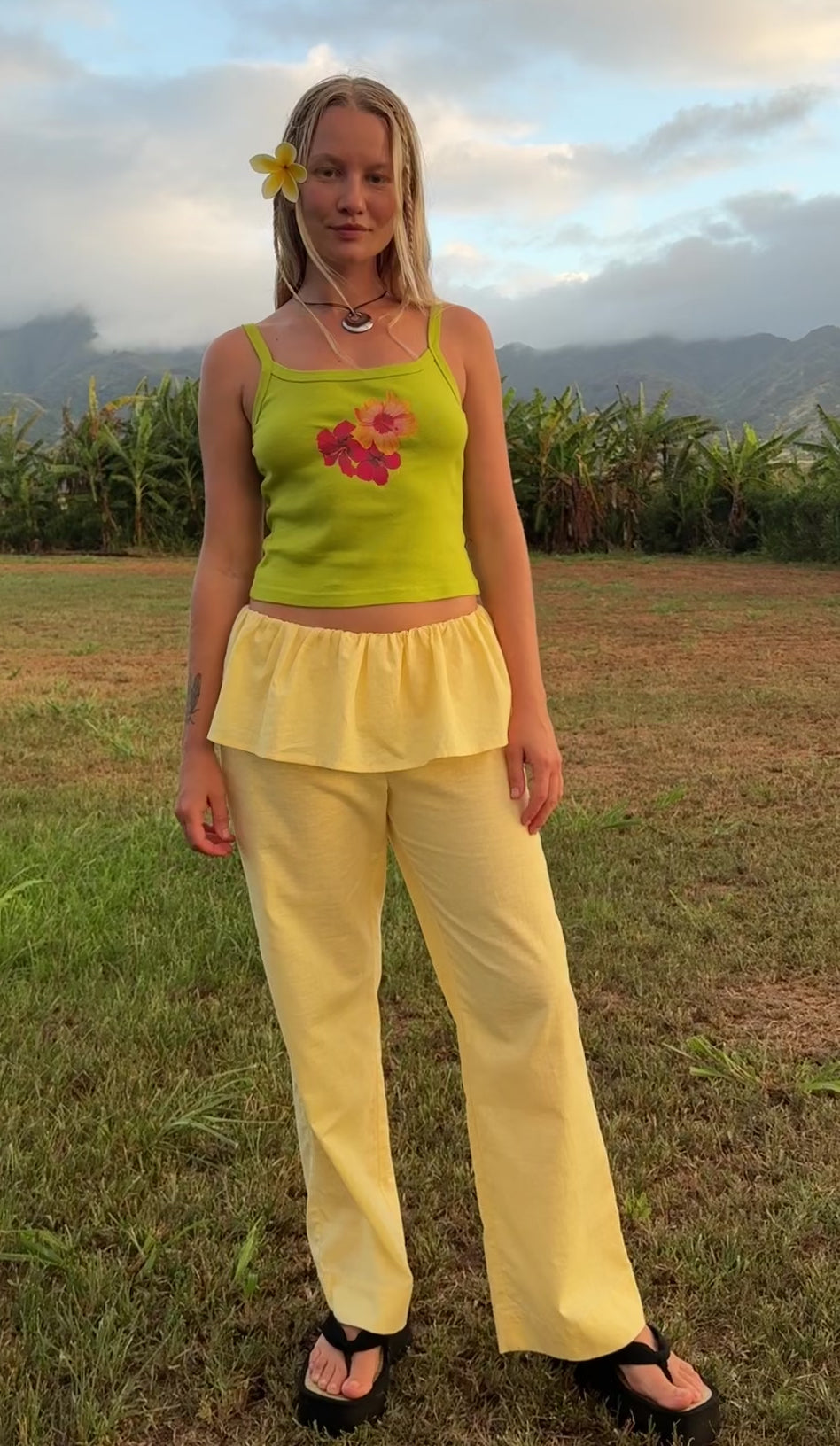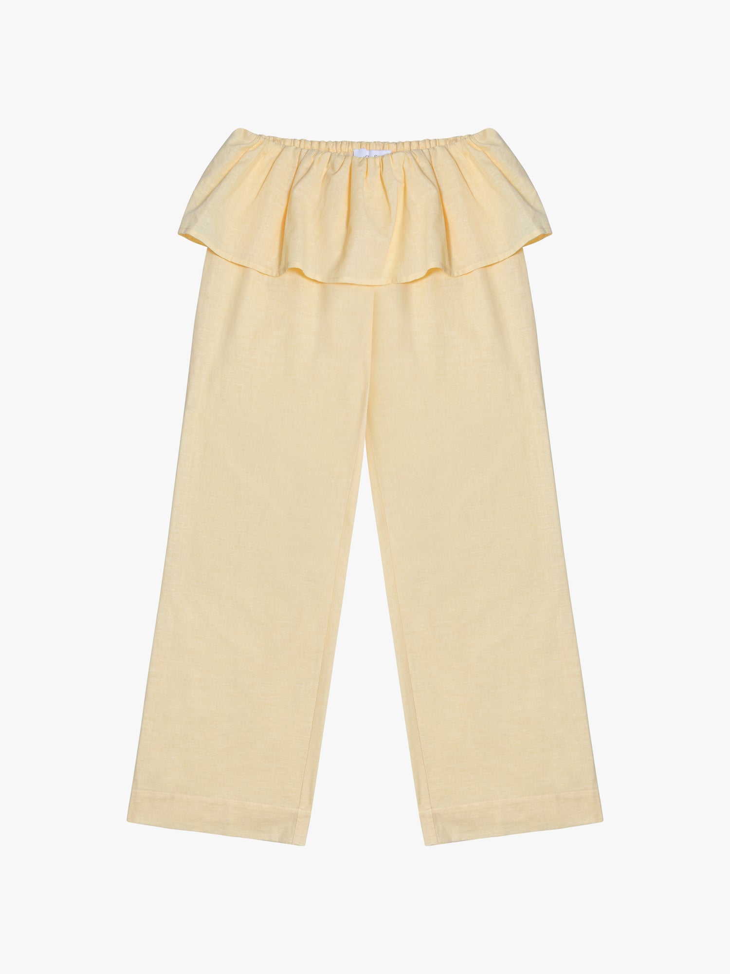 Introducing the Renee Pant: Straight leg linen blend pants with a tiered ruffle skirt attachment at top featured in a perfect butter yellow color and an elasticized waistband. Unlined.