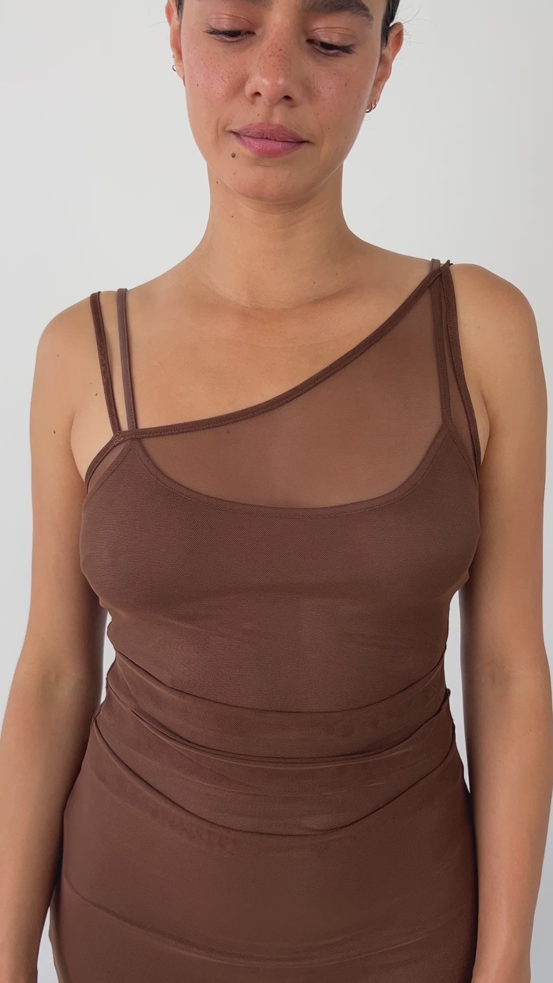 The Reversible Mesh Dress features a tank slip dress layered under an asymmetrical ruched mesh midi dress. Both pieces feature adjustable straps. Can be worn separately or together.