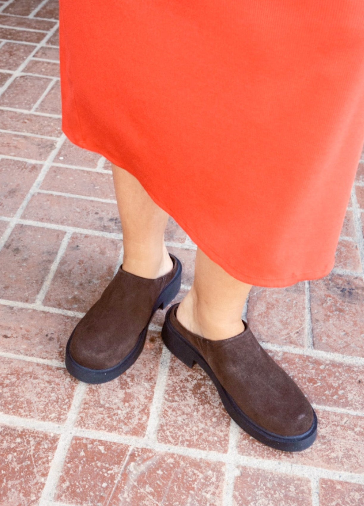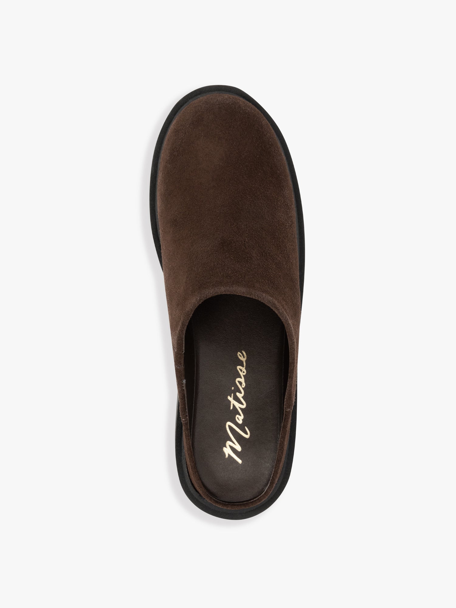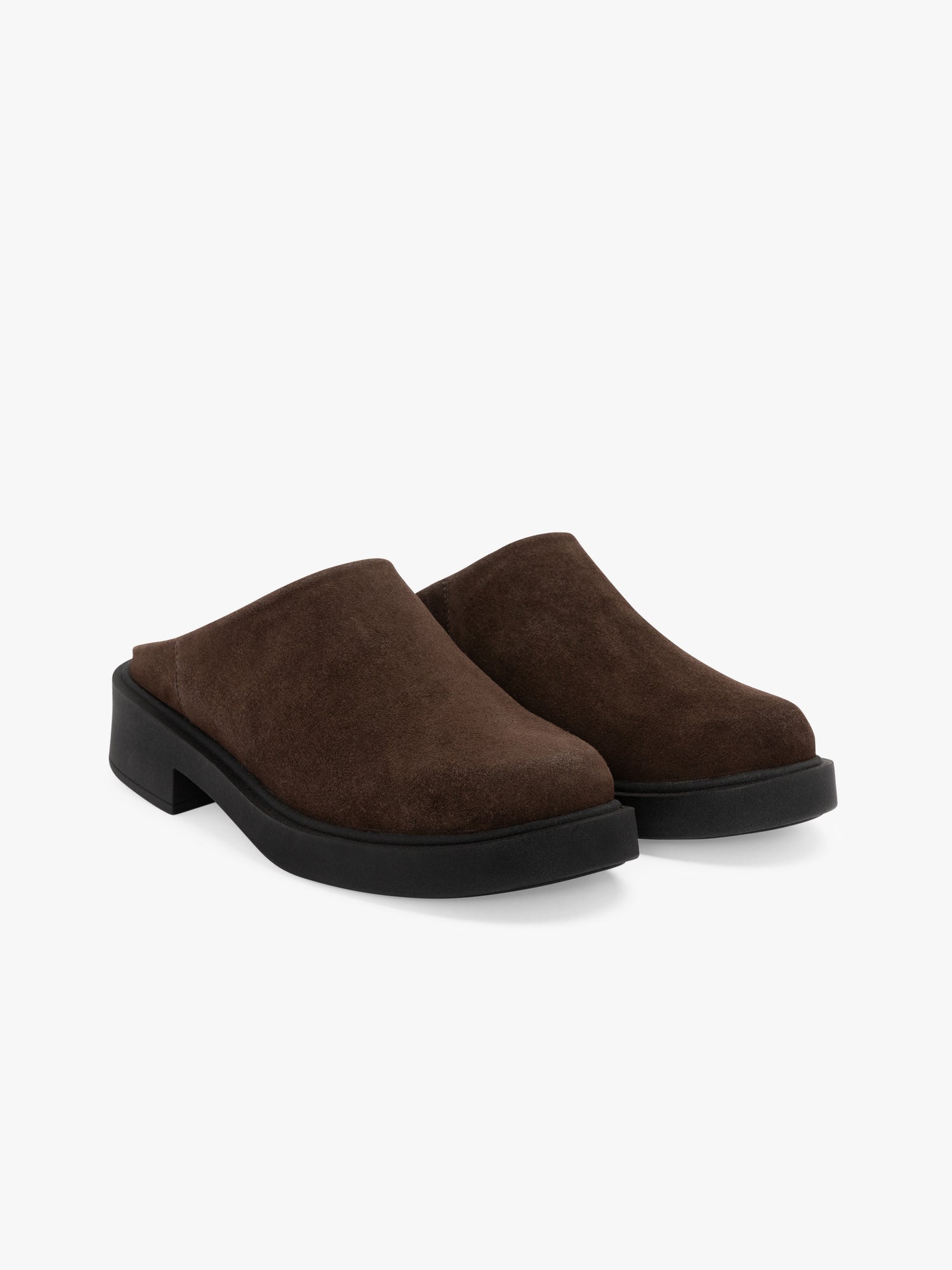 A classic mule silhouette with a brown suede upper and a 1.5" black rubber heel.