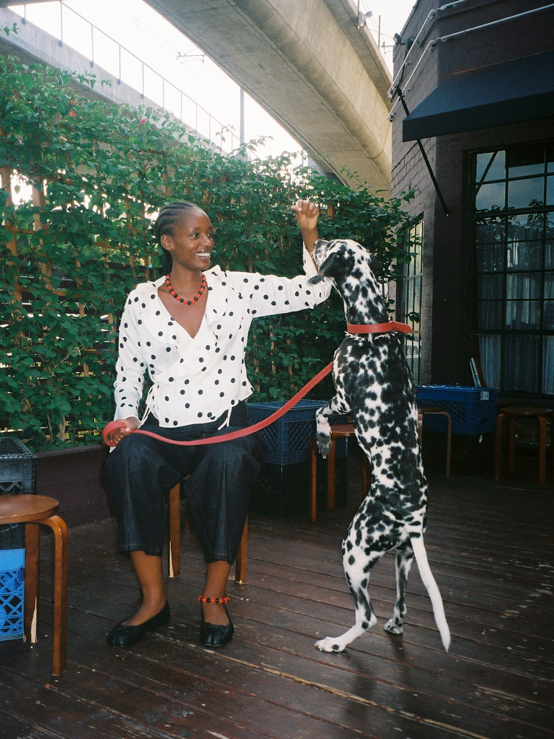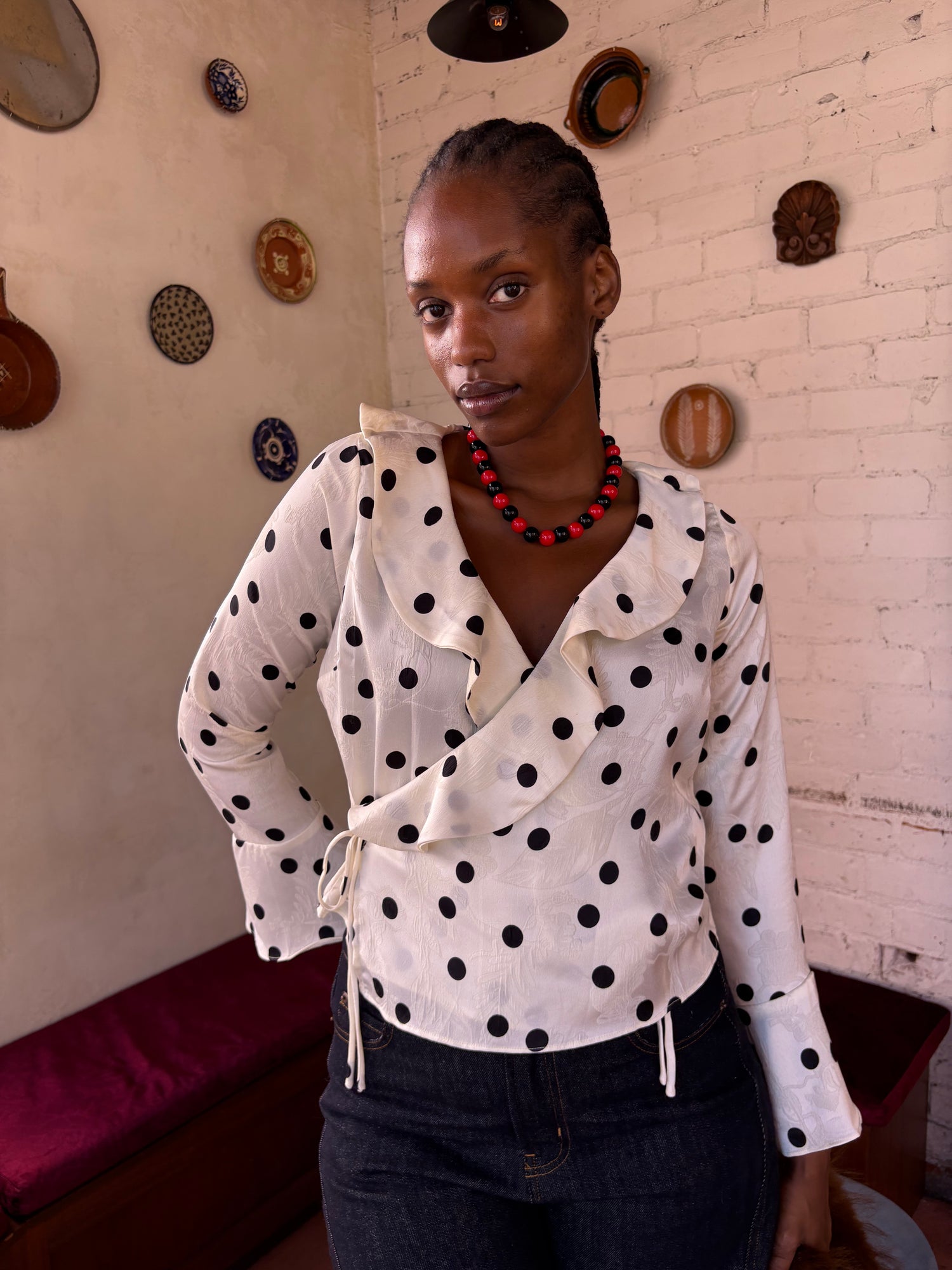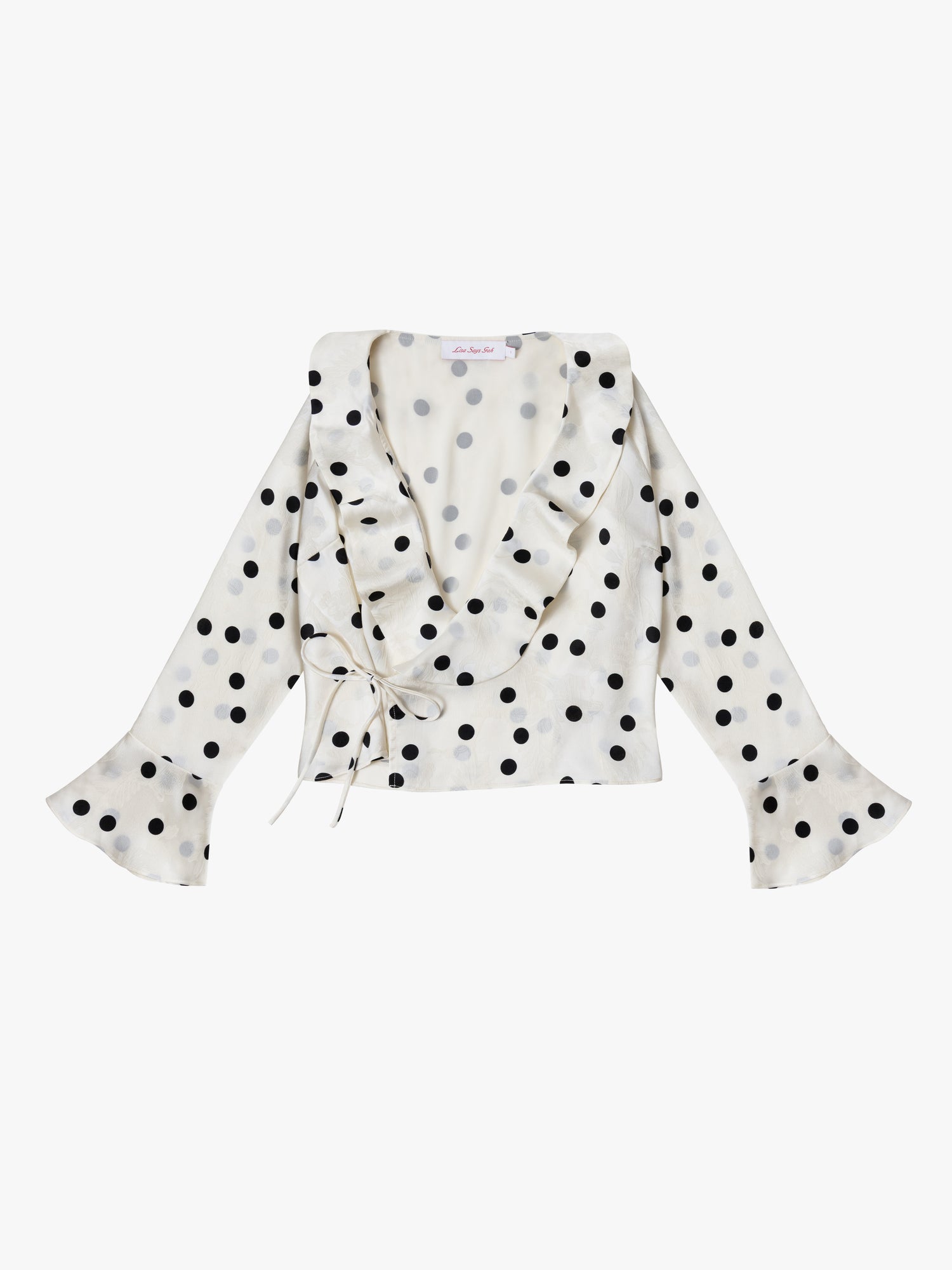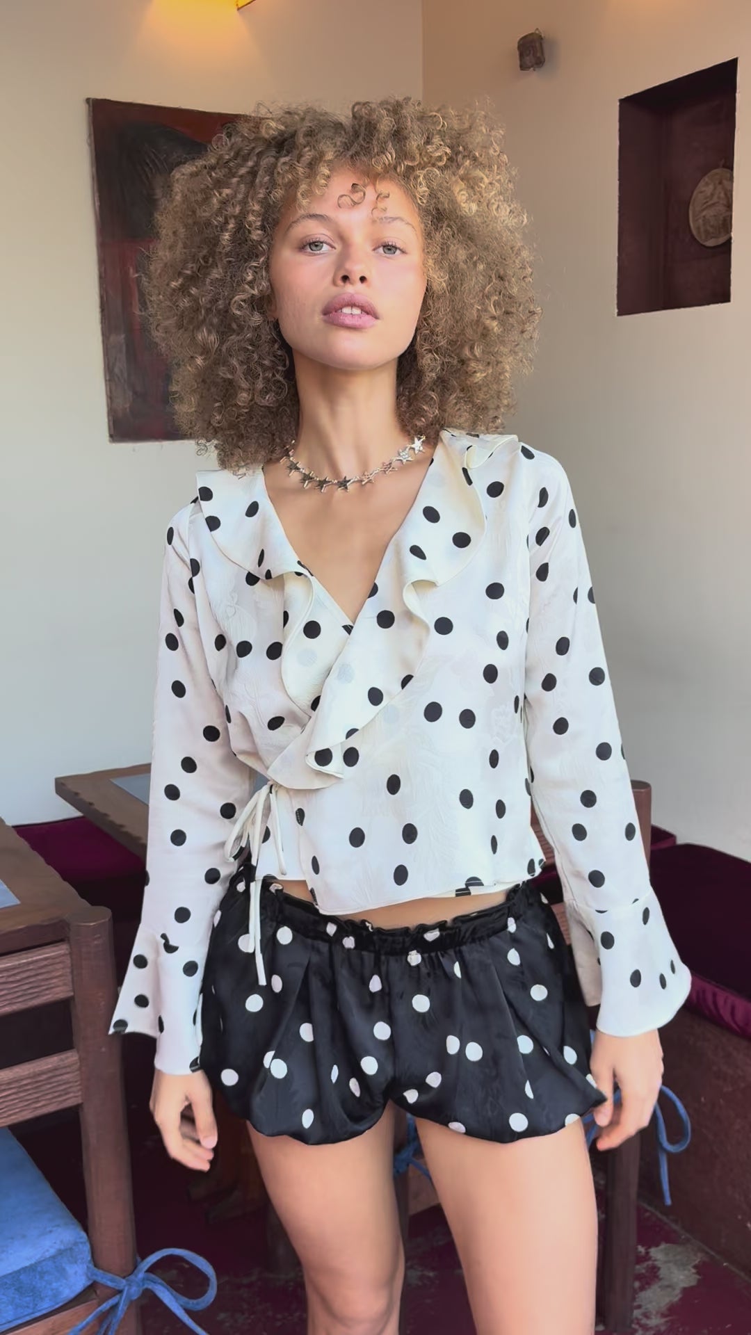 Introducing the Ricki Wrap Top: Playful and romantic, the Ricki Wrap Top features a deep V-neckline framed with a ruffled collar and a flattering tie-front closure. Made in a silky cream fabric with bold black polka dots, this top adds an effortless statement to any outfit. Flared sleeves and a cropped silhouette make it perfect for pairing with high-waisted denim or a sleek mini skirt.