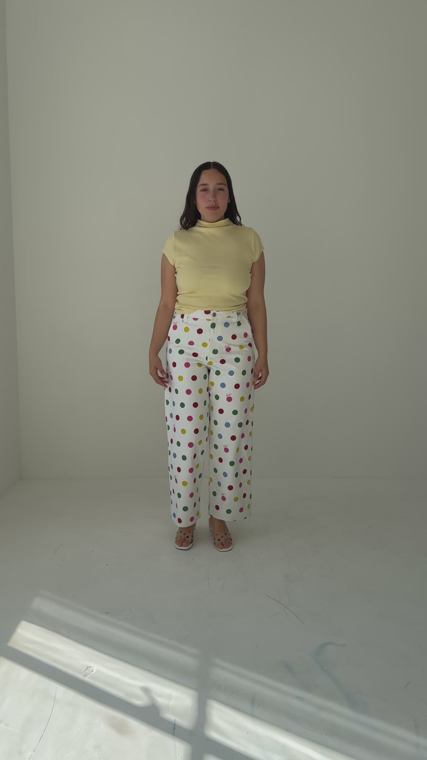 Workwear denim in a colorful polka-dot 'Gah!' print, featured in a primary color-way.