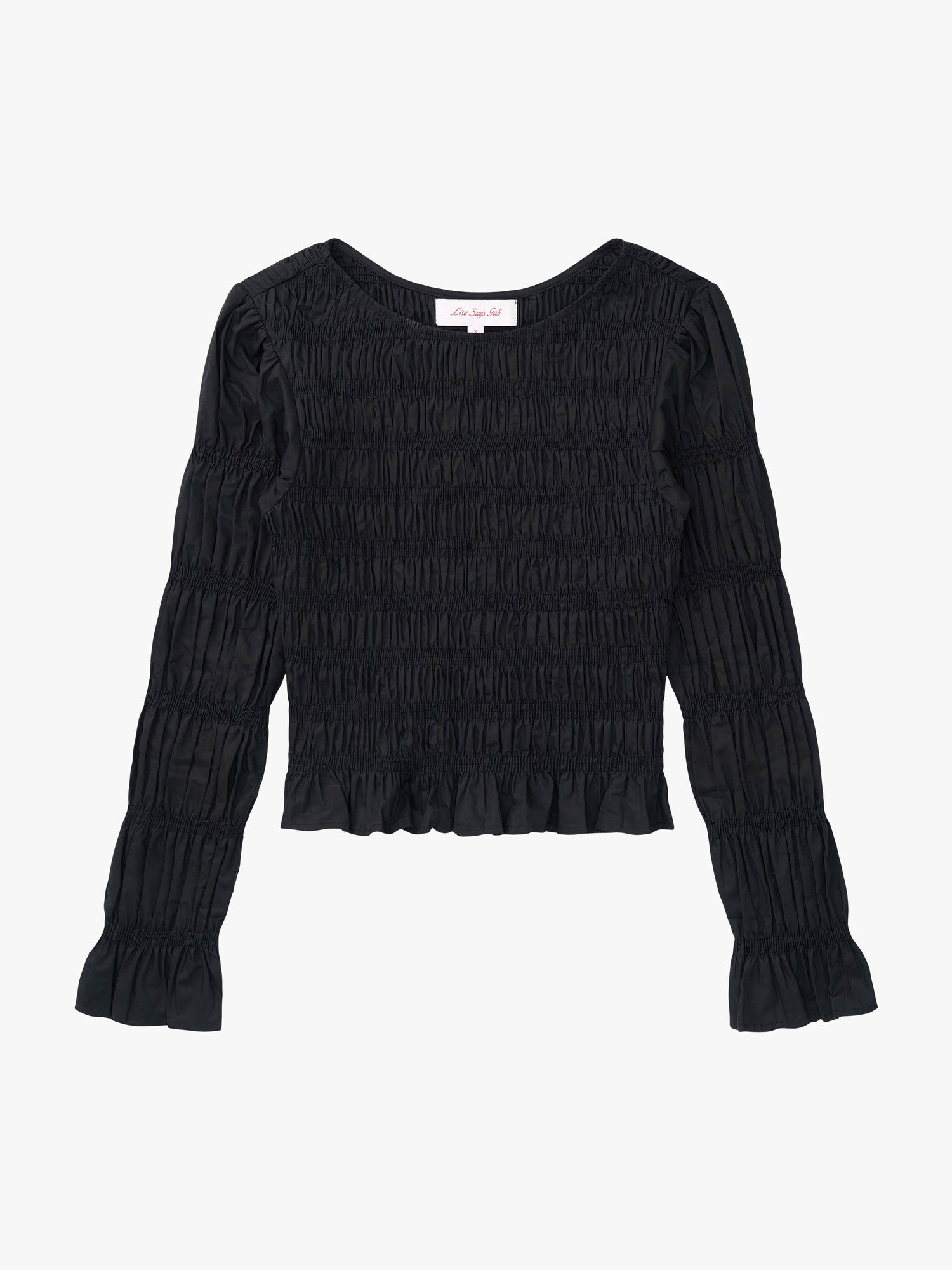 The Rue Smocked Top is a long sleeve top that features ruching throughout for a fitted silhouette and a fun detail. This top comes in a simple black, making it a perfect staple for every outfit.