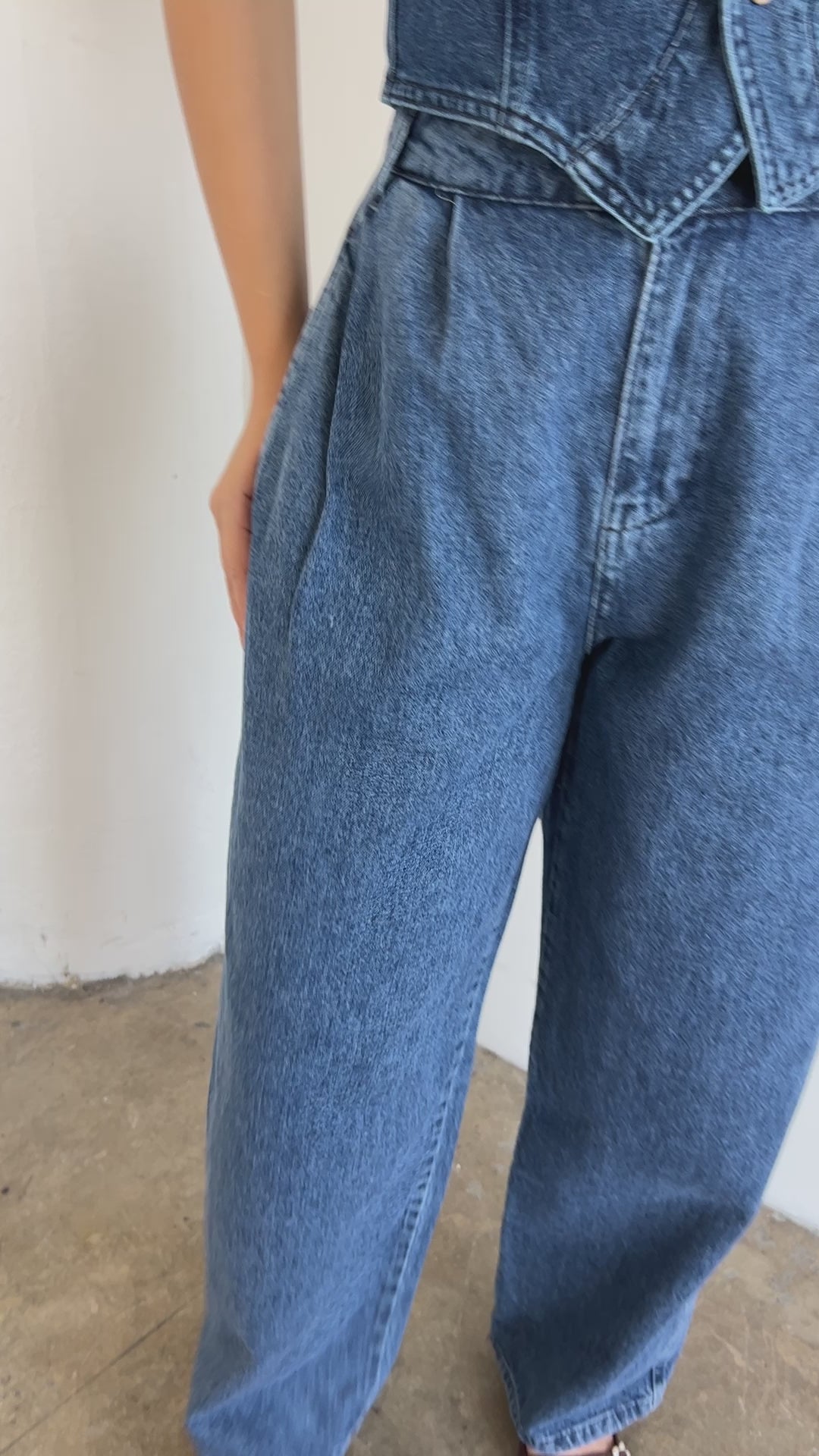 A vintage wash denim pant with a fitted high waist and pleated front with a wide leg. This style is fits snug at the waist with zero stretch, so we recommend sizing up if you're looking for a looser fit.