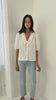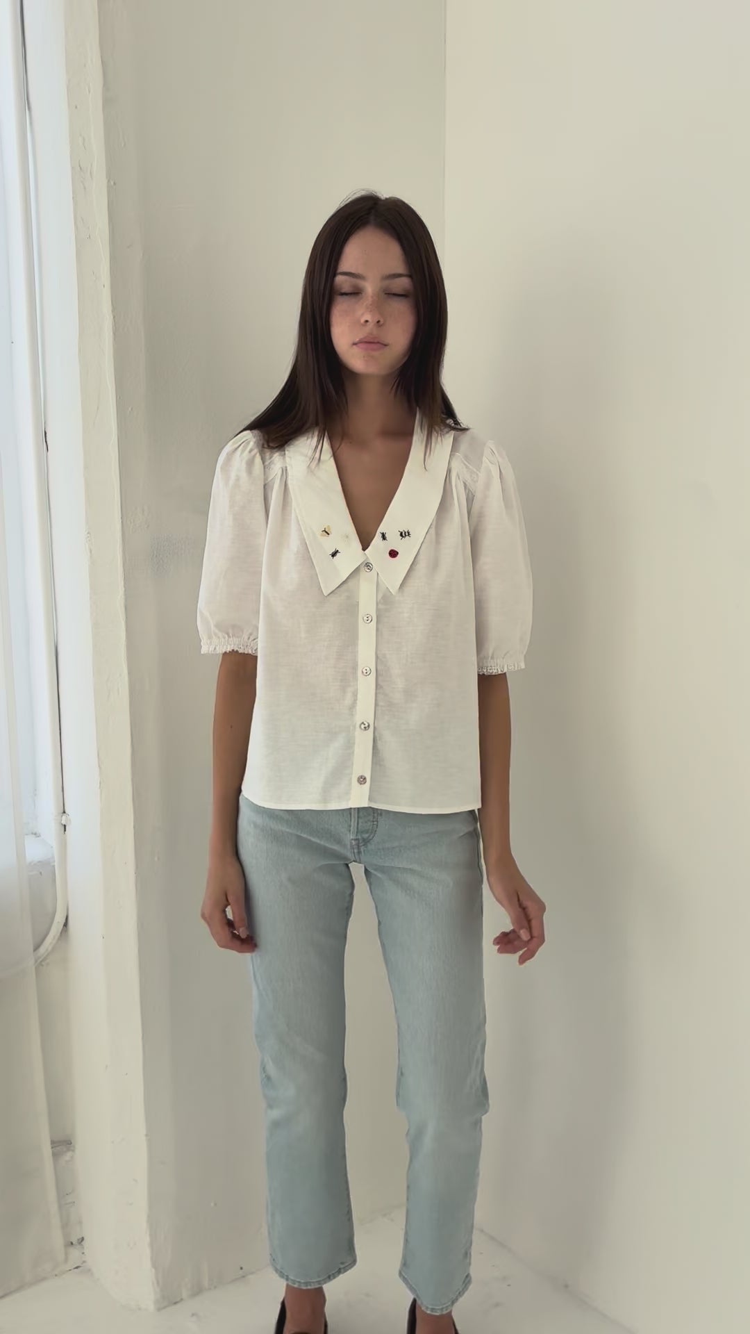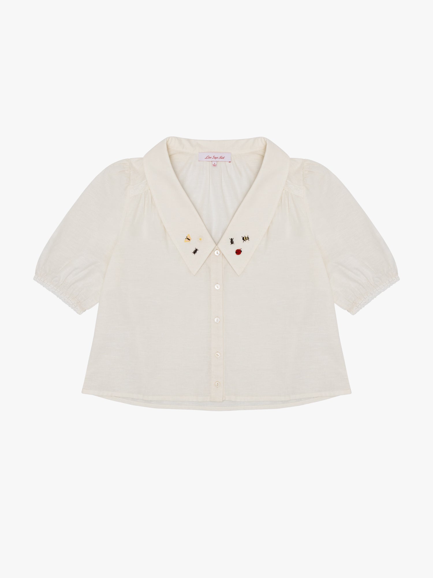 The Sam Top is a boxy linen button up featured in a white cotton/linen blend with a dramatic pointed collar design and an elasticated sleeve opening for a comfortable fit. Featuring a playful garden critter embroidery at the collar.