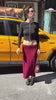 Introducing the Sammy Skirt: This red midi skirt features a crinkle-textured fabric for a relaxed look. It has a straight fit that falls below the knee and is finished with shell buttons at the waist for a subtle touch of detail. A scalloped hem adds a soft finish. Unlined.
