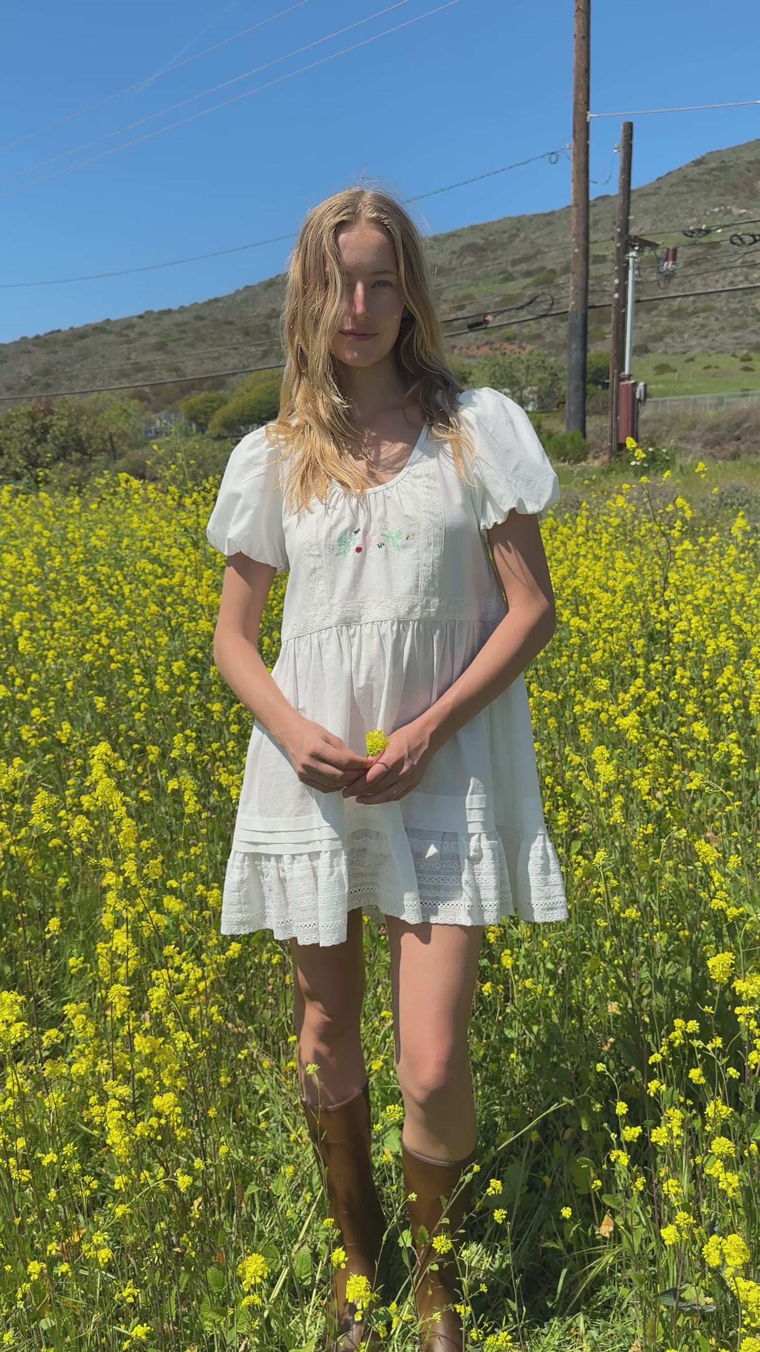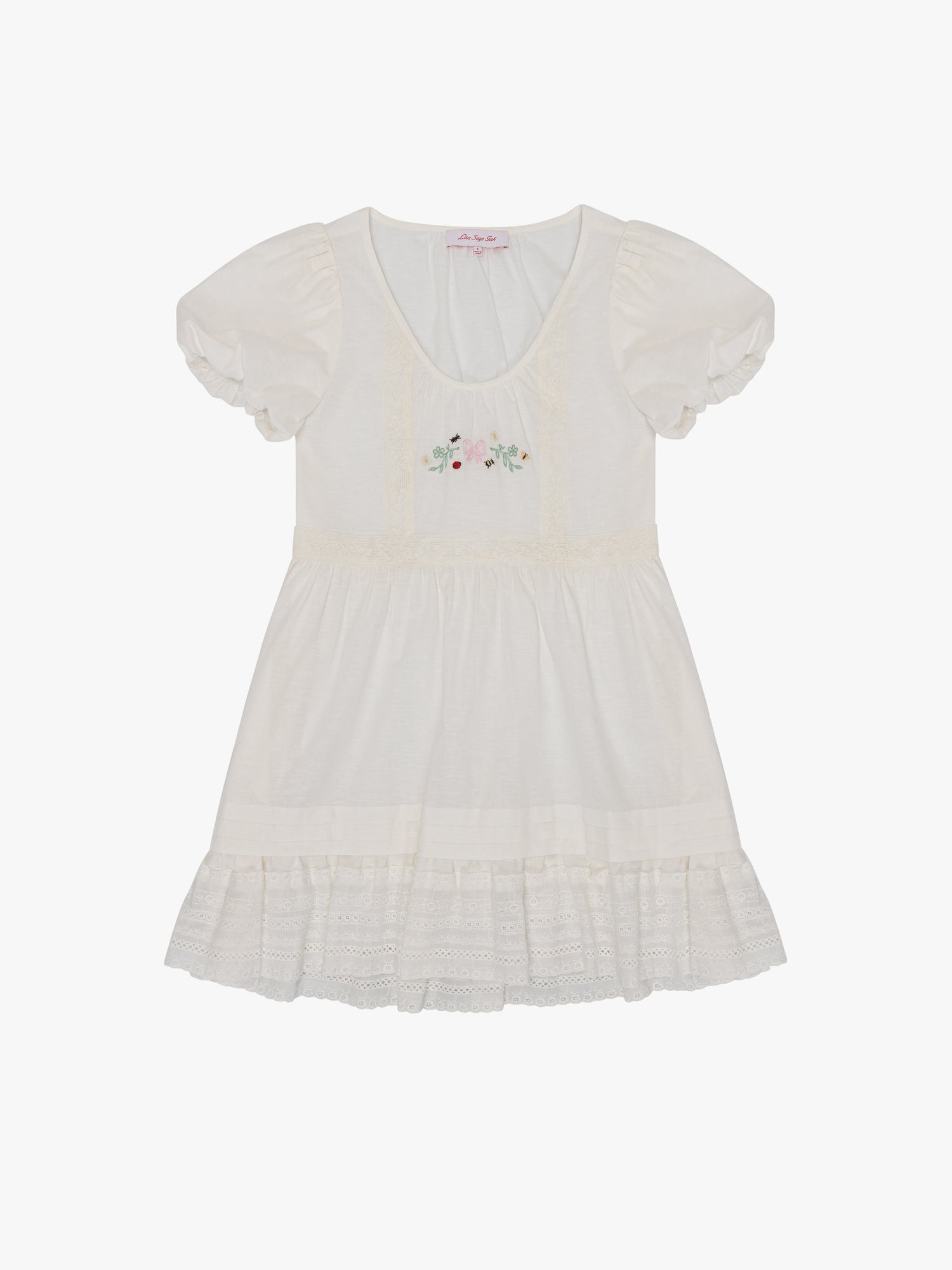 Mini babydoll dress with a puff sleeve and tiered details at the skirt. Featured our signature Garden Critter Embroidery at front.