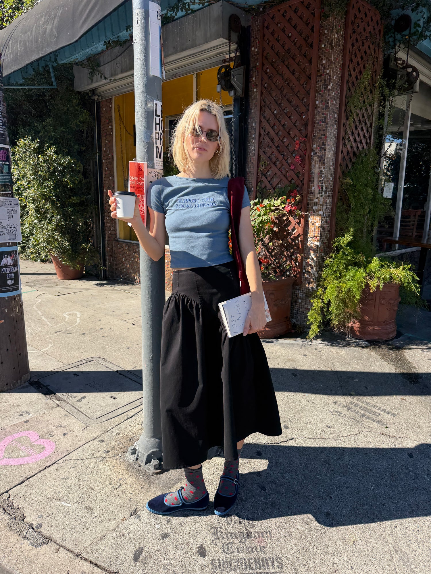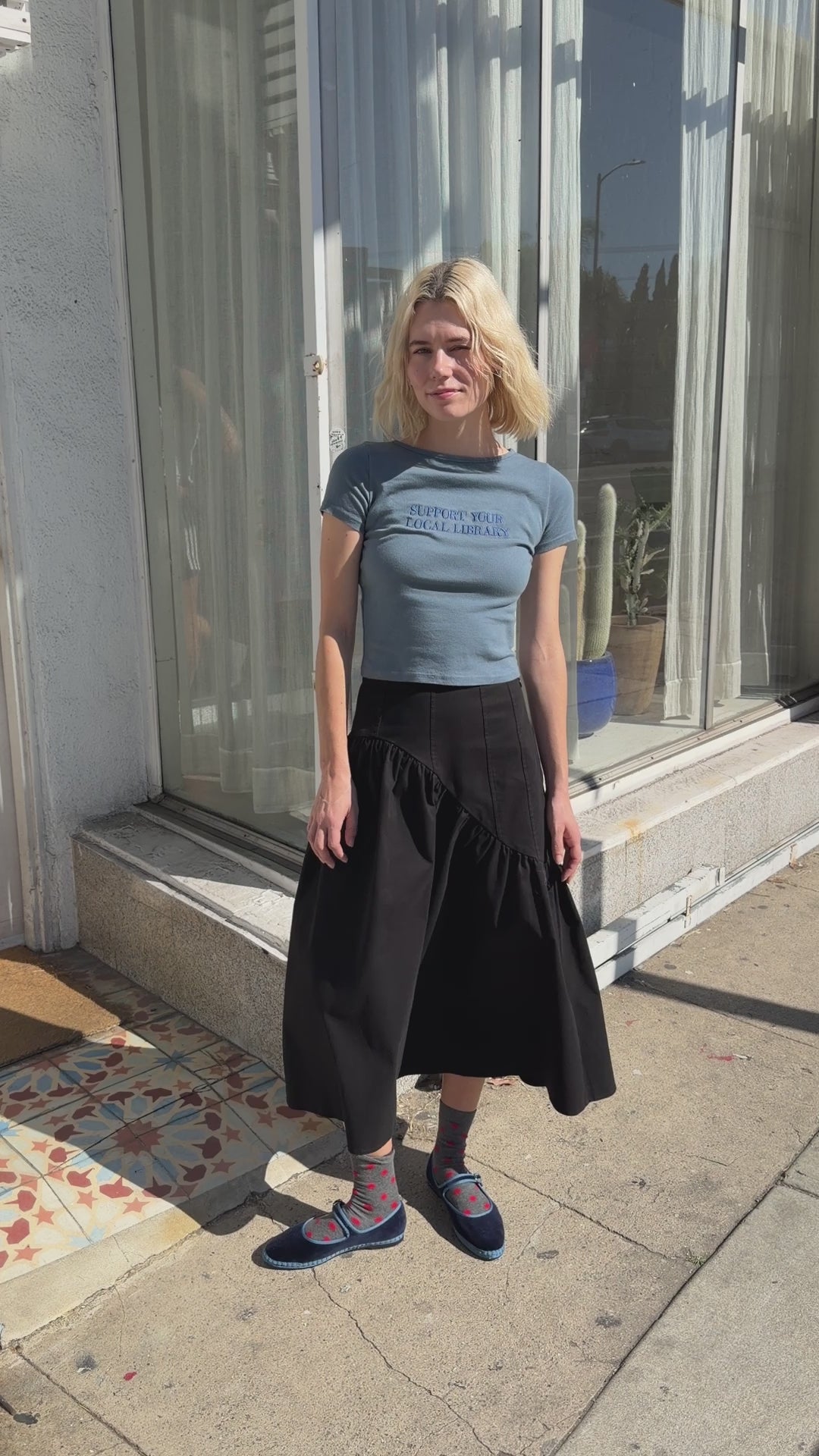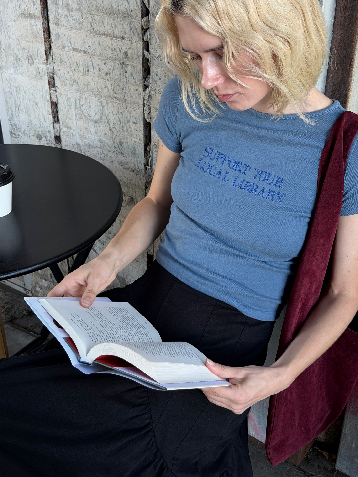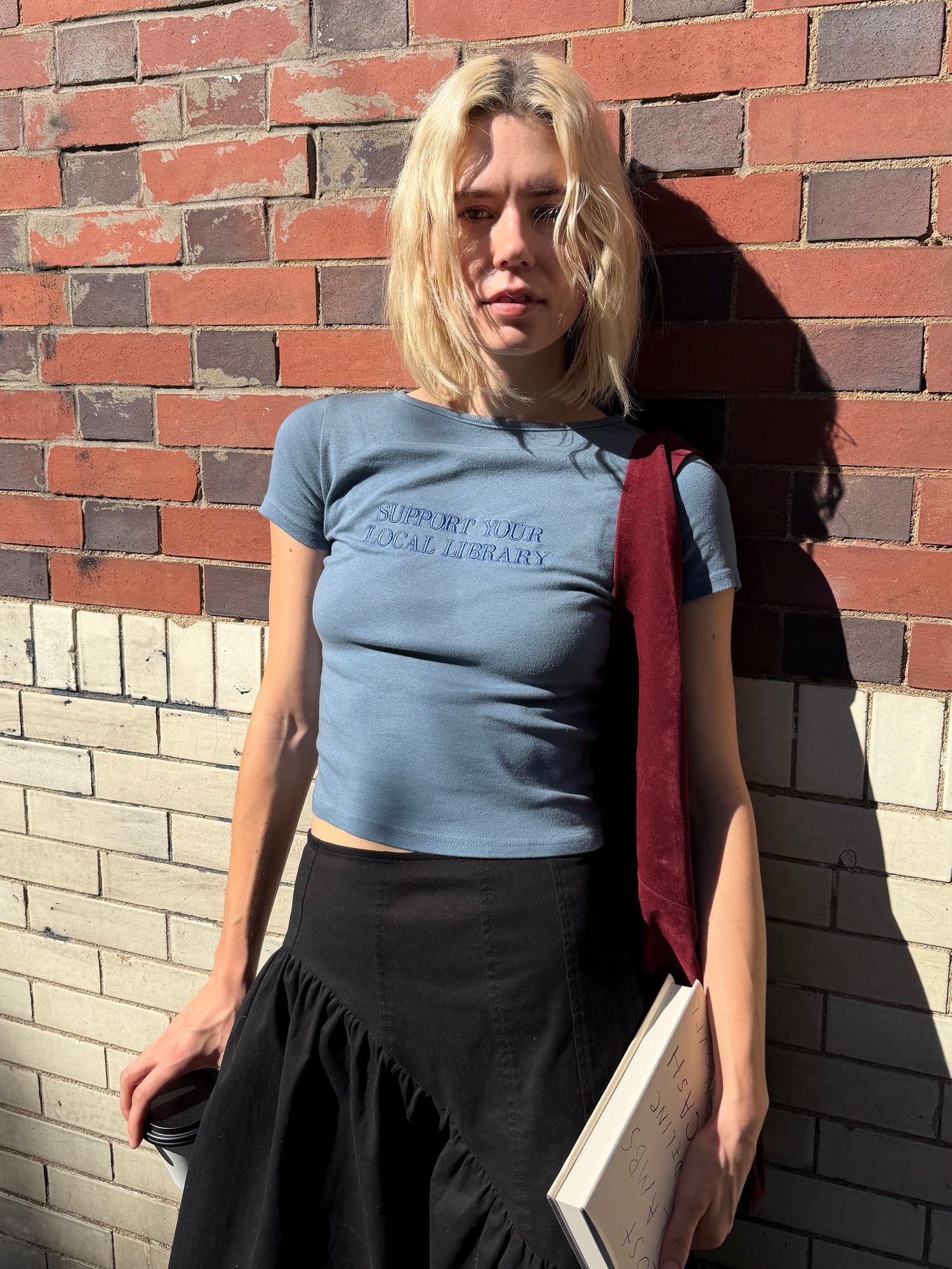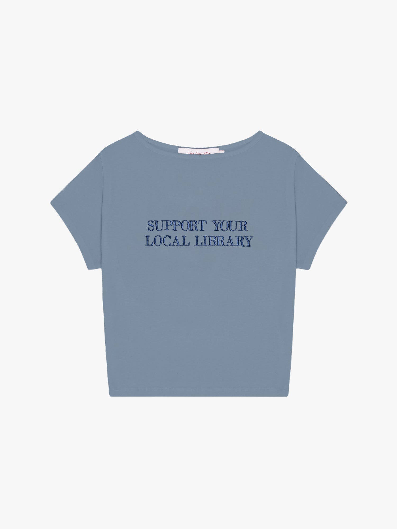 SEEN LIBRARY x LISA SAYS GAH: Head to your local library in this perfect tee from our collaboration with Seen Library the multi-city community that comes together for in-person book exchanges. Our best-selling Alex Tee now coming to you in a classic blue cropped baby t-shirt in a lightweight cotton jersey, featuring a gorgeous embroidery reading "Support Your Local Library." - *Every purchase comes with a matching bookmark*
