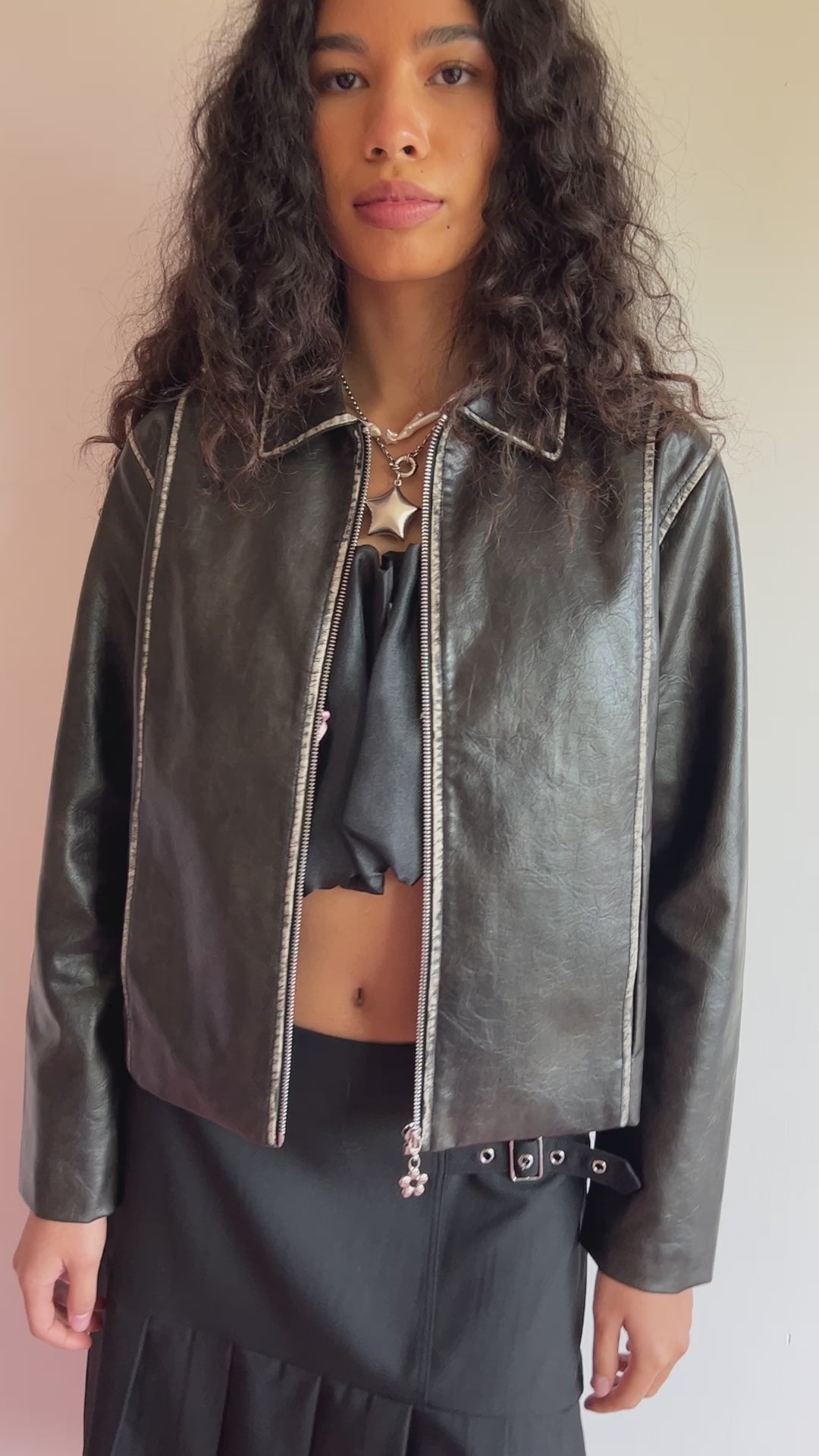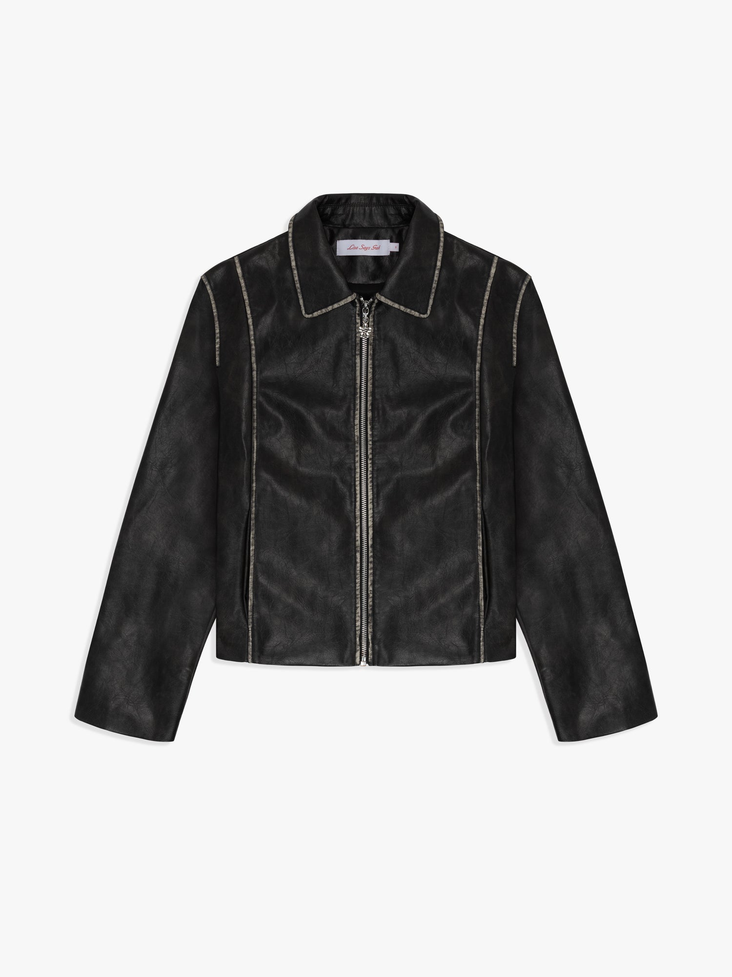 Faux leather fitted jacket with a zip closure and side-seam pockets. Featured in a vintage-inspired distressed fabric.