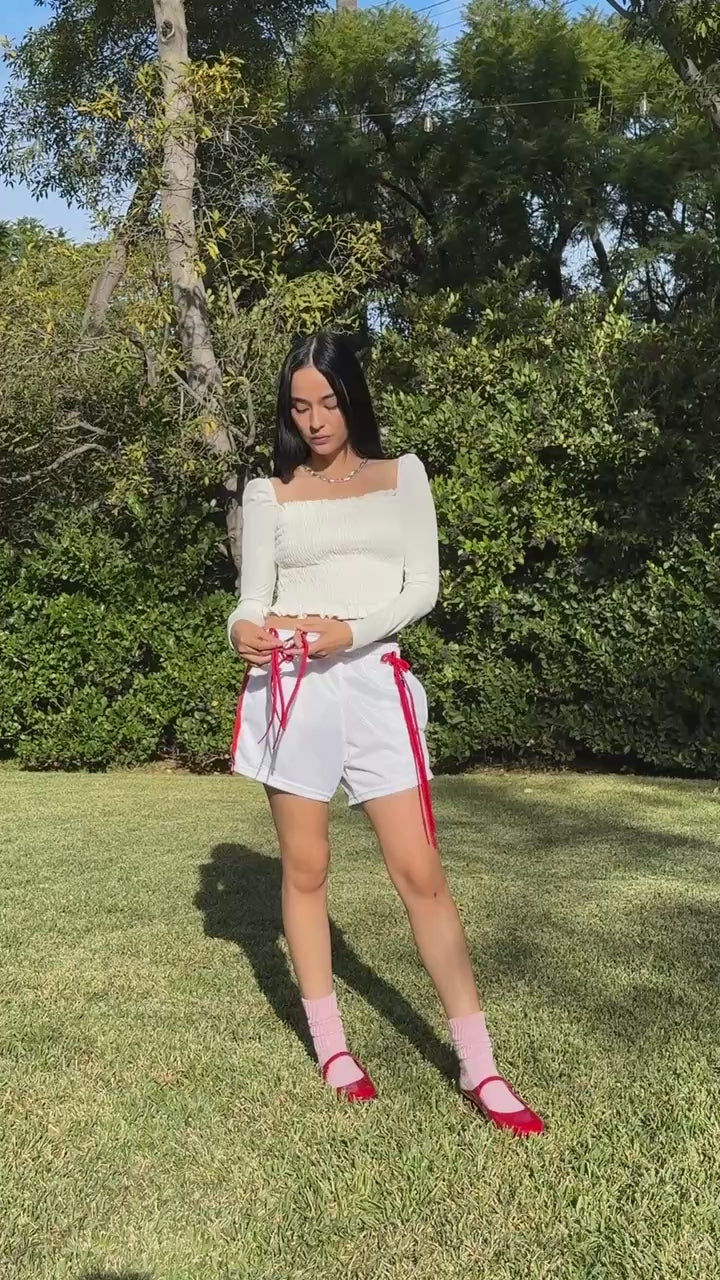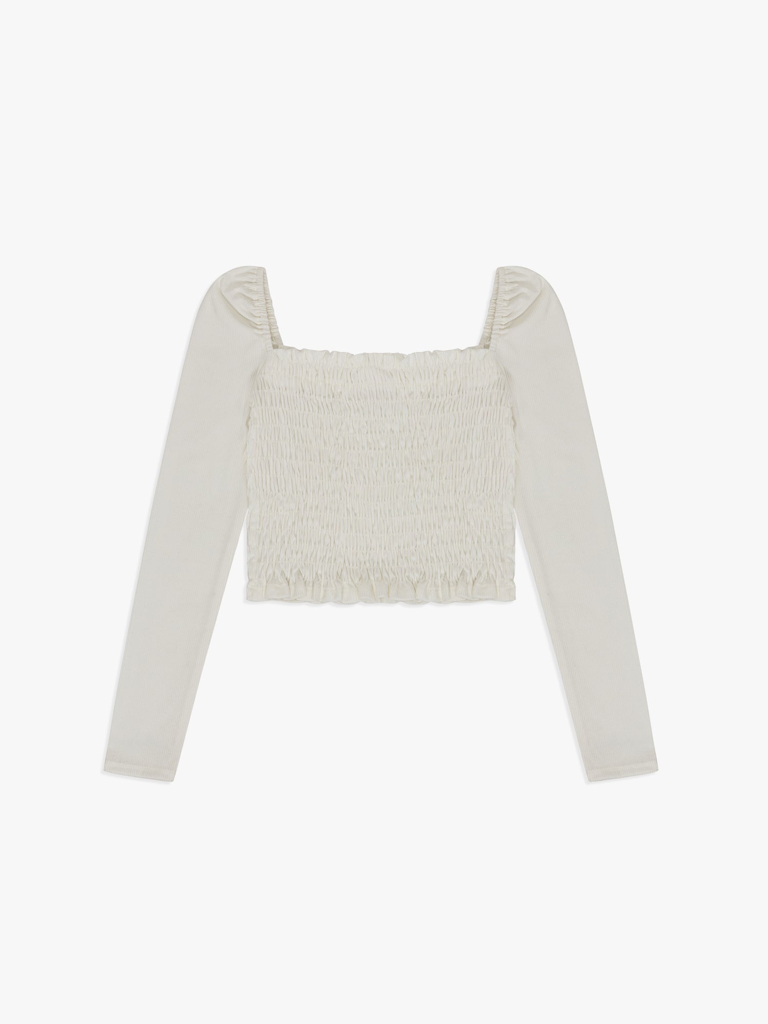 Ivory smocked long-sleeve top with a cropped fit. Fits true to size.