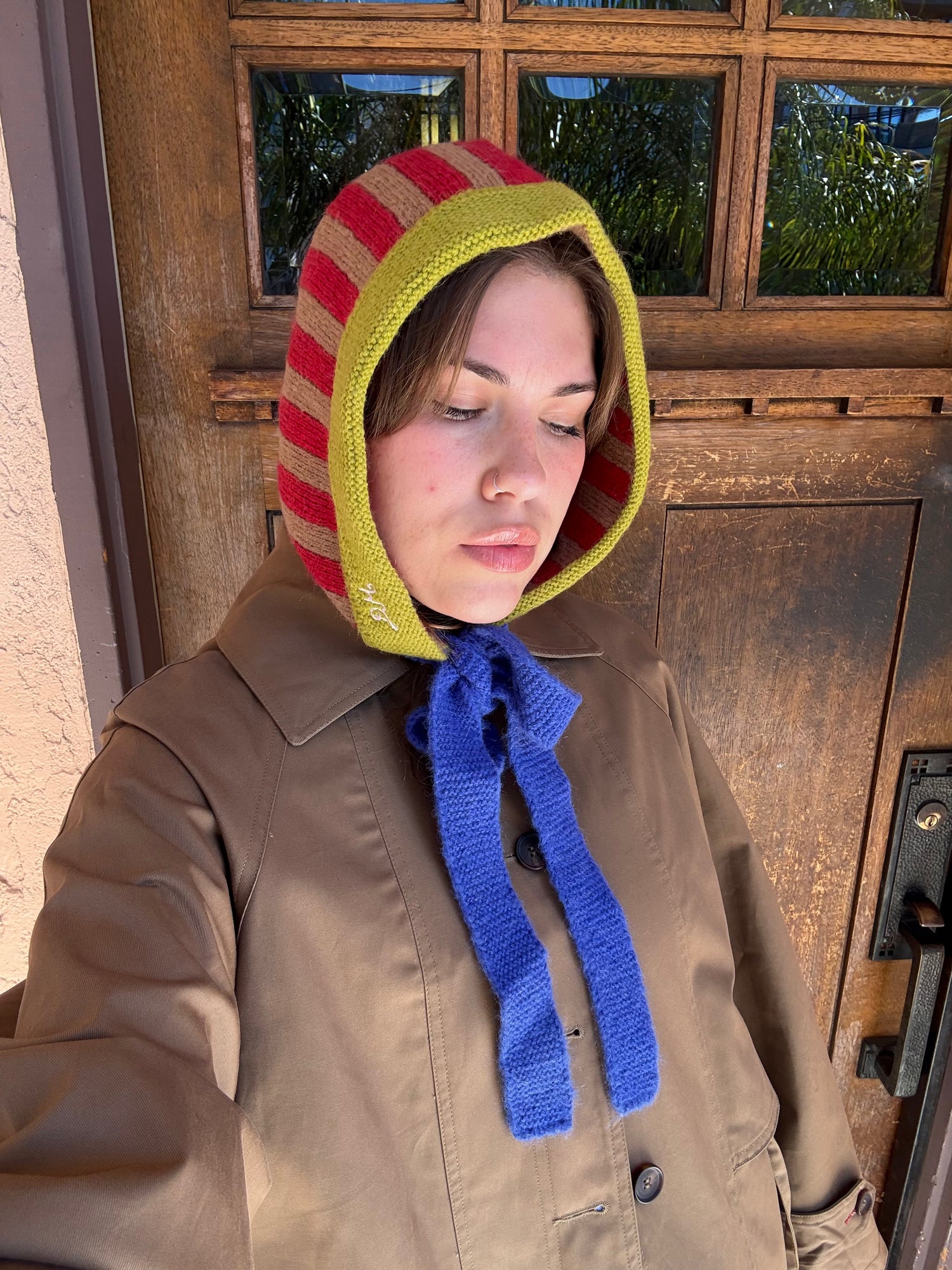 A bold twist on a winter classic. This color-block knit bonnet features a mixed stripe design with a red-striped body, contrast blue ties, and an olive green hood opening for standout appeal. Finished with subtle DM embroidery for a signature touch.