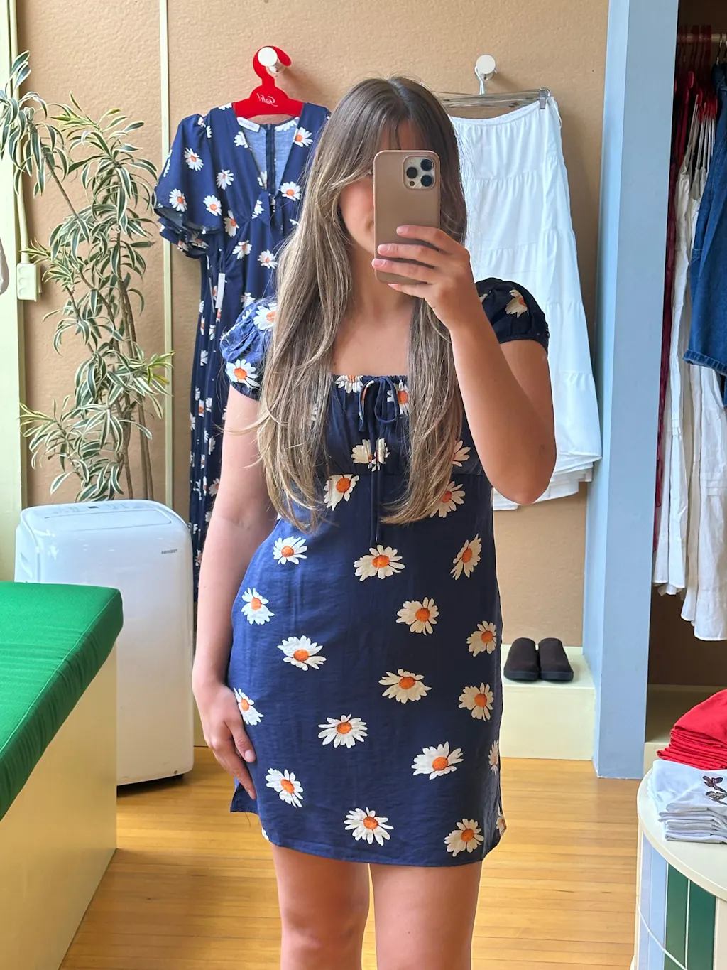 Mini dress featured in our signature Navy Daisy print. This dress has an elasticized sleeve and neckline for a comfortable fit. Slightly snug in the hips- suggest to size up if wanting a looser fit in the hips.