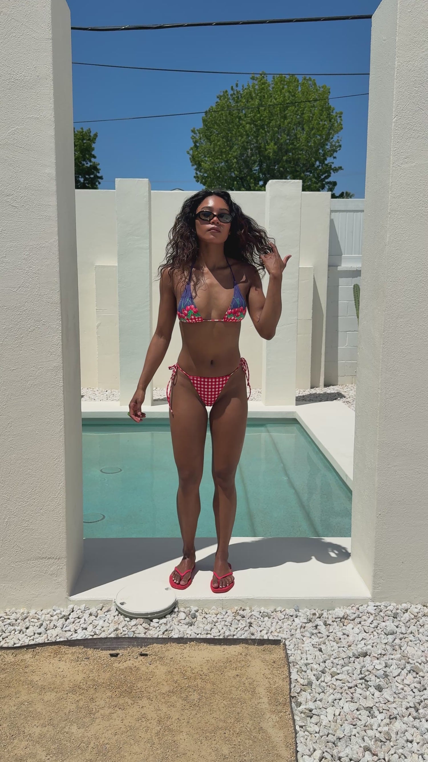 Triangle bikini top featured in a Cherry and red gingham print and includes a signature DM embroidery.