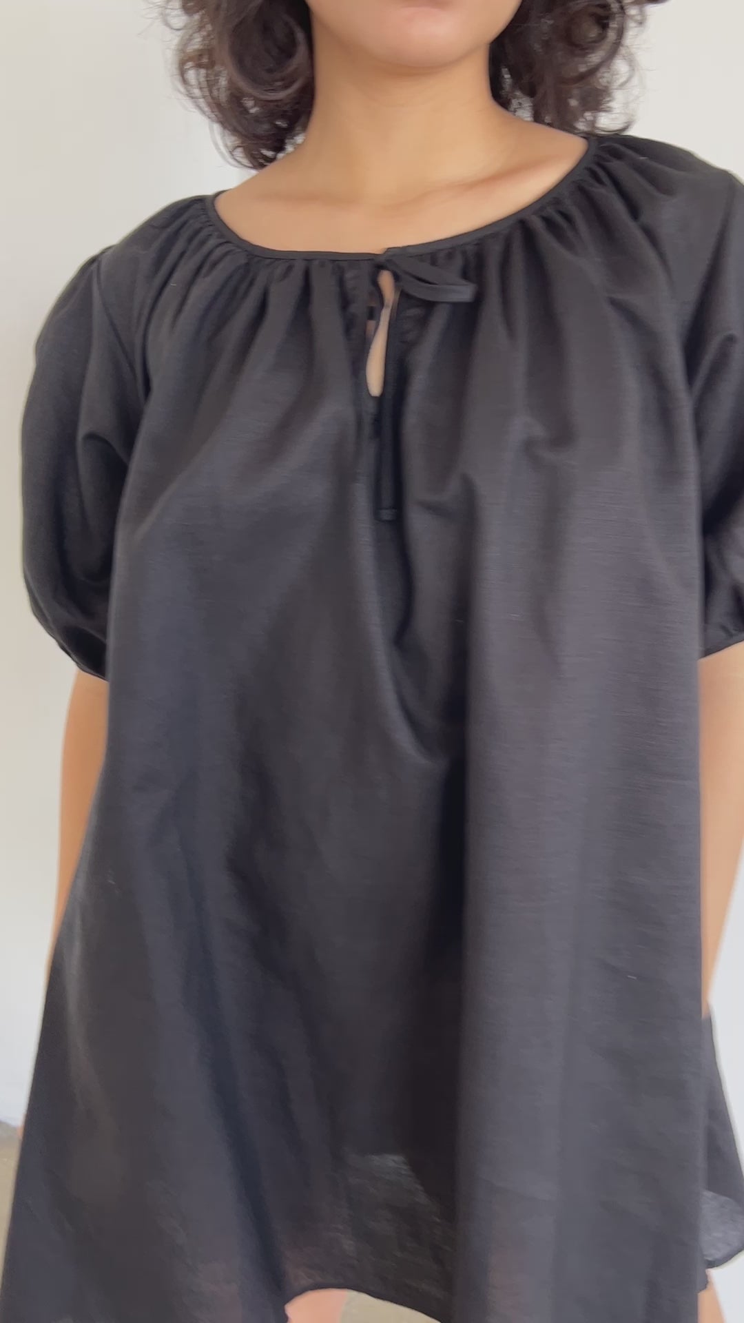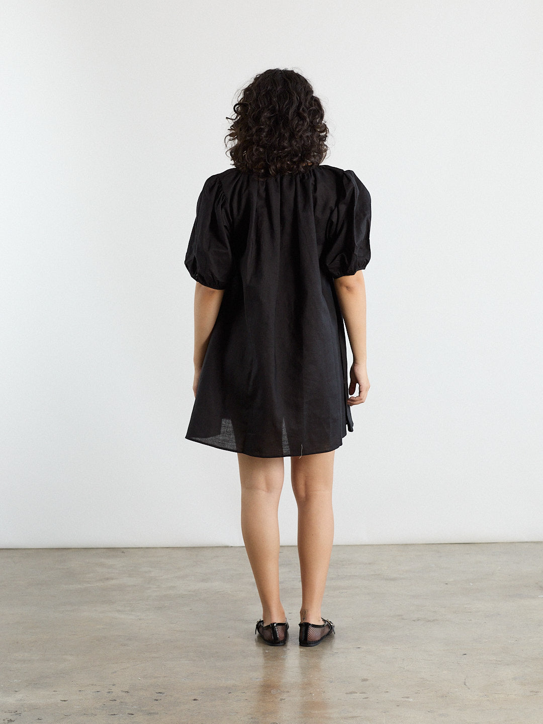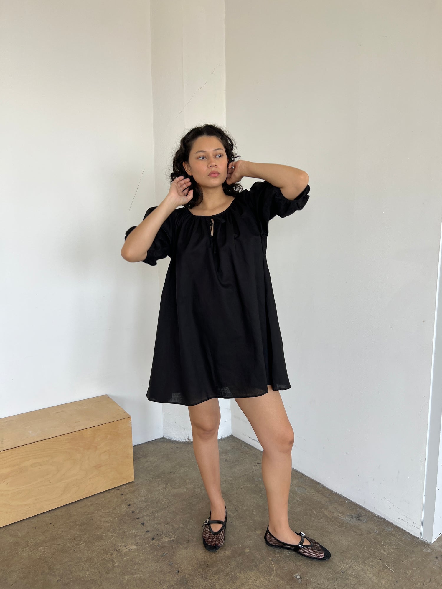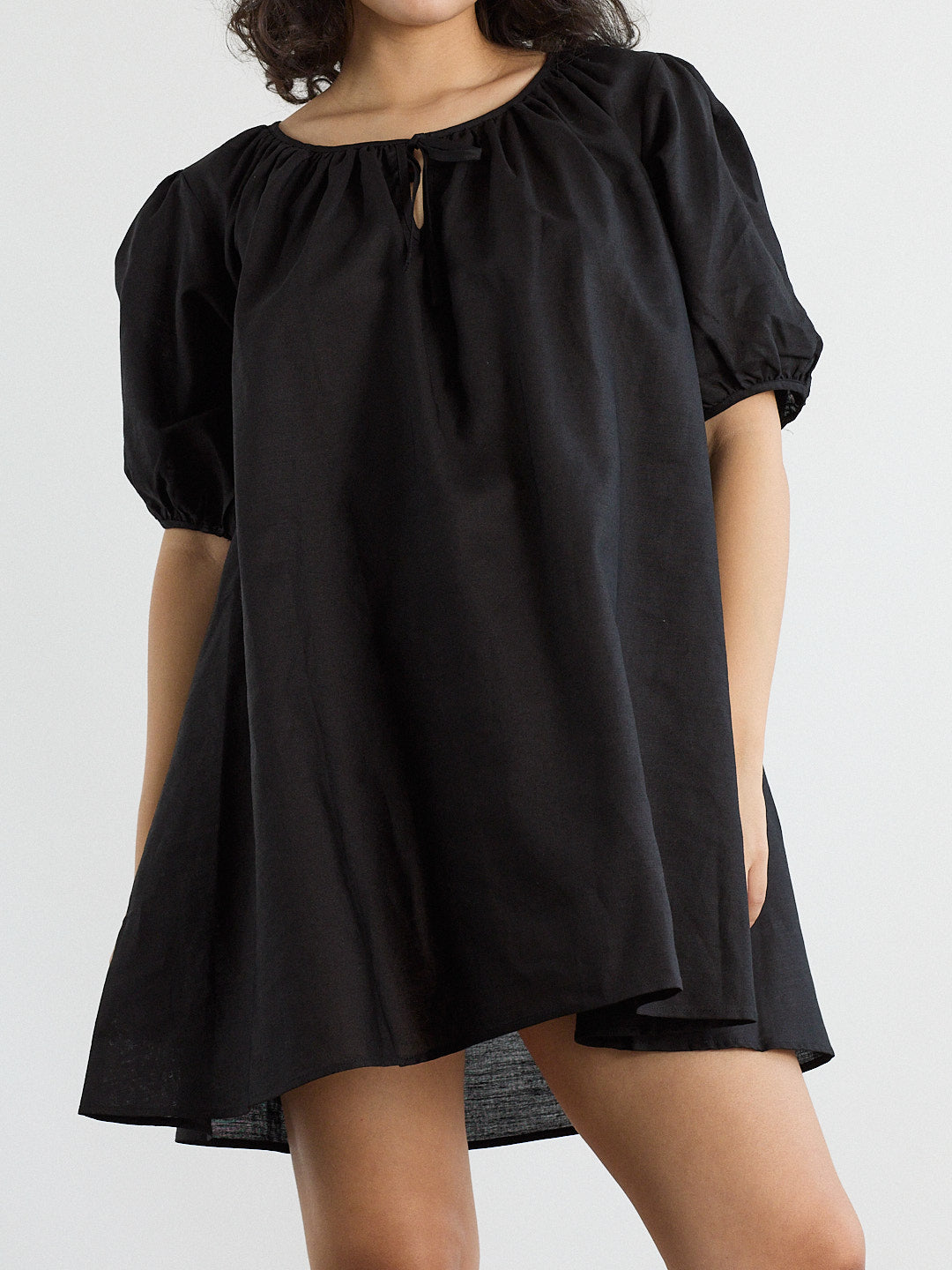 An adorable mini babydoll dress with puff sleeves and a tie front. Made with a lightweight linen-like fabric.