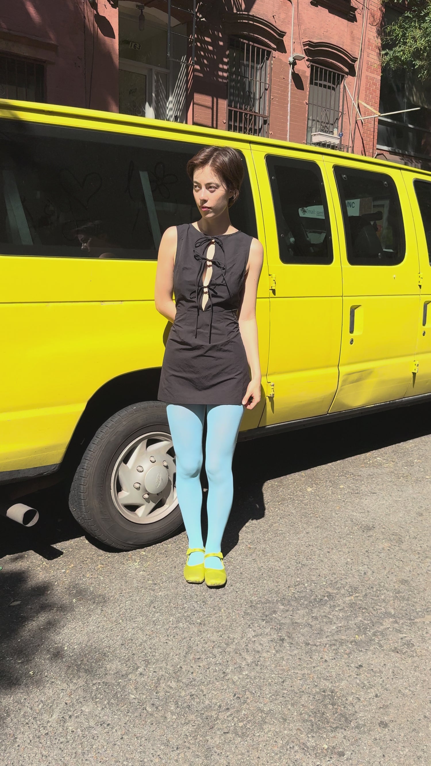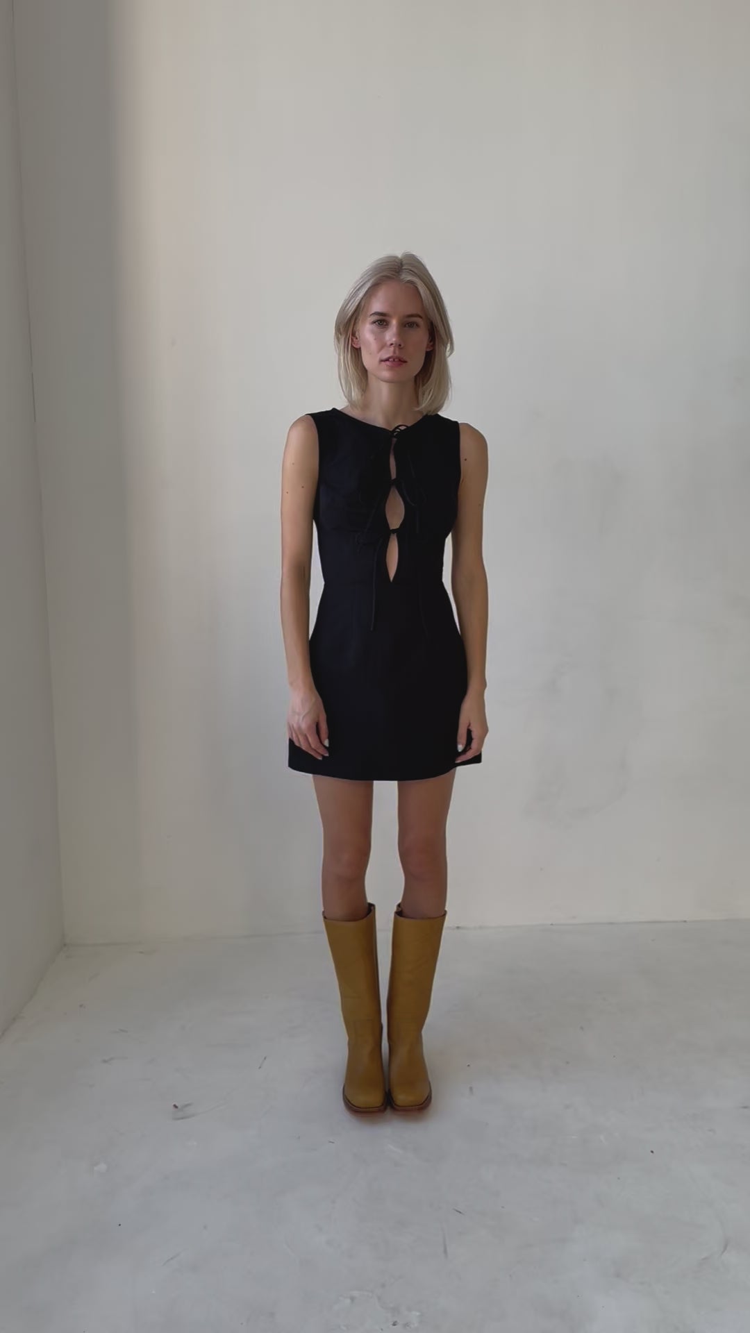 A black mini dress featuring a boat neck and 3 ties at front. Features a zipper at back. Unlined.
