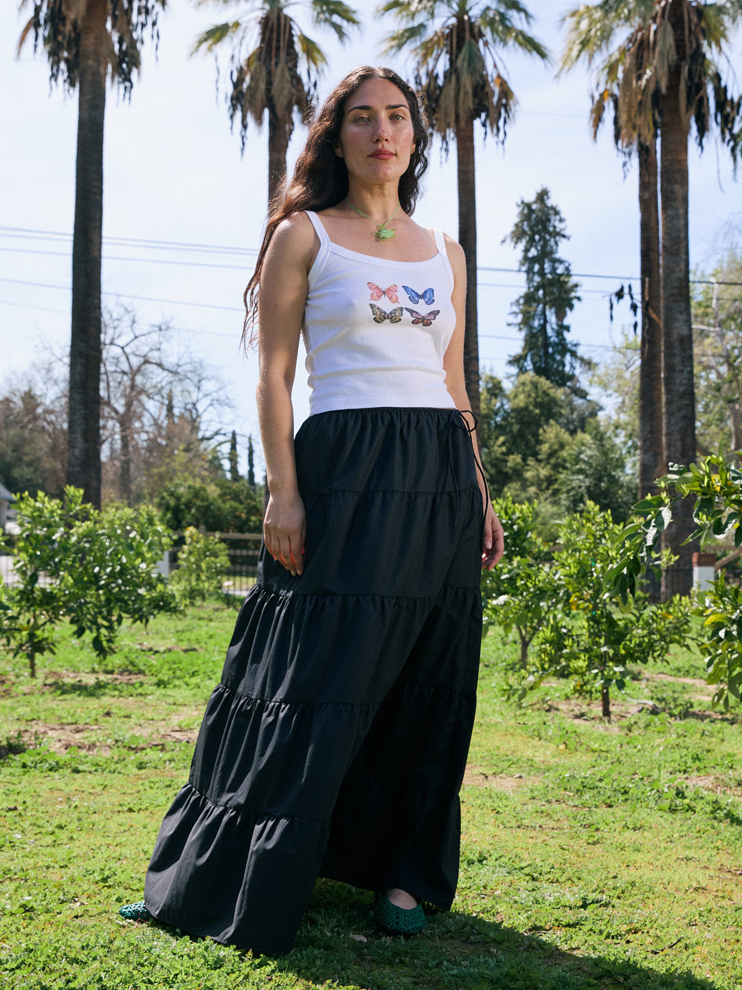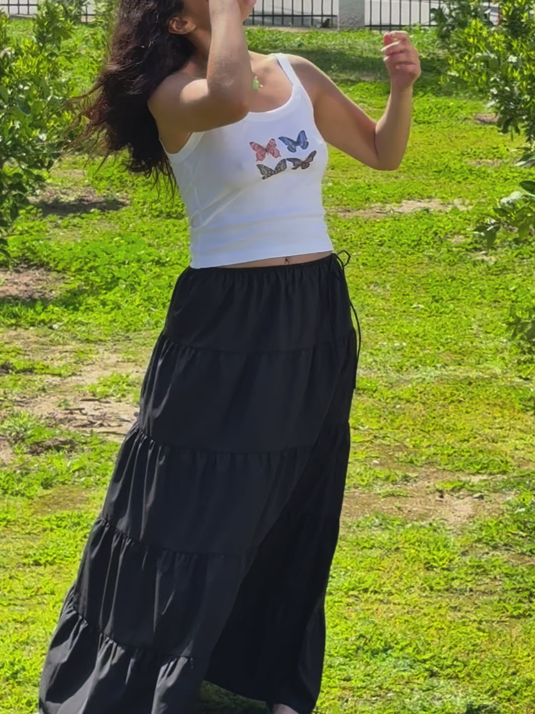 Tiered black maxi skirt featuring a side tie that is both for function and fun. Made out of 100% cotton and partially lined for comfort. This skirt runs slightly big. We suggest sizing down by 2 size.