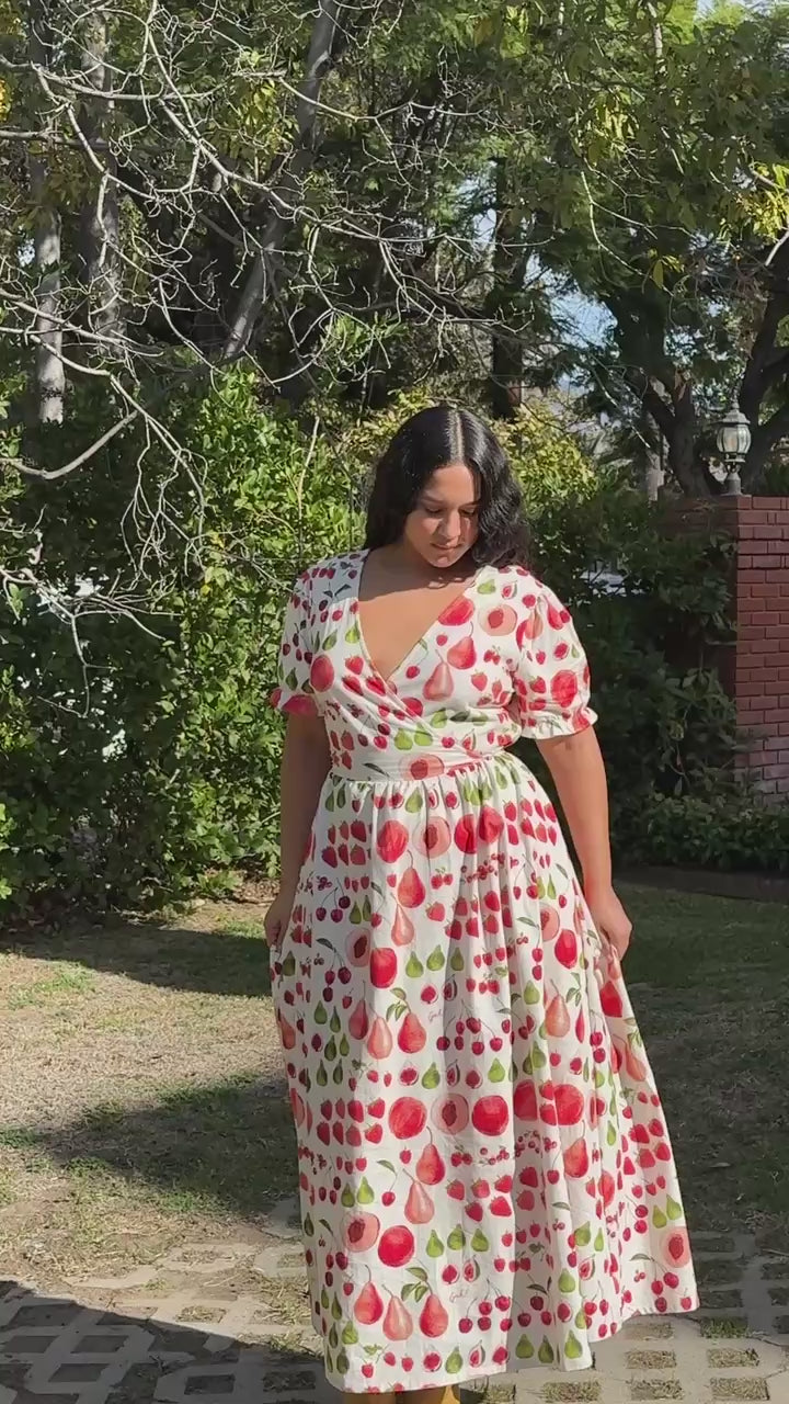 Midi-dress featuring puff sleeves, a surplice neckline, and a tie at the waist and smocked back panel for a versatile fit. This dress is featured in our iconic LSG fruit print.