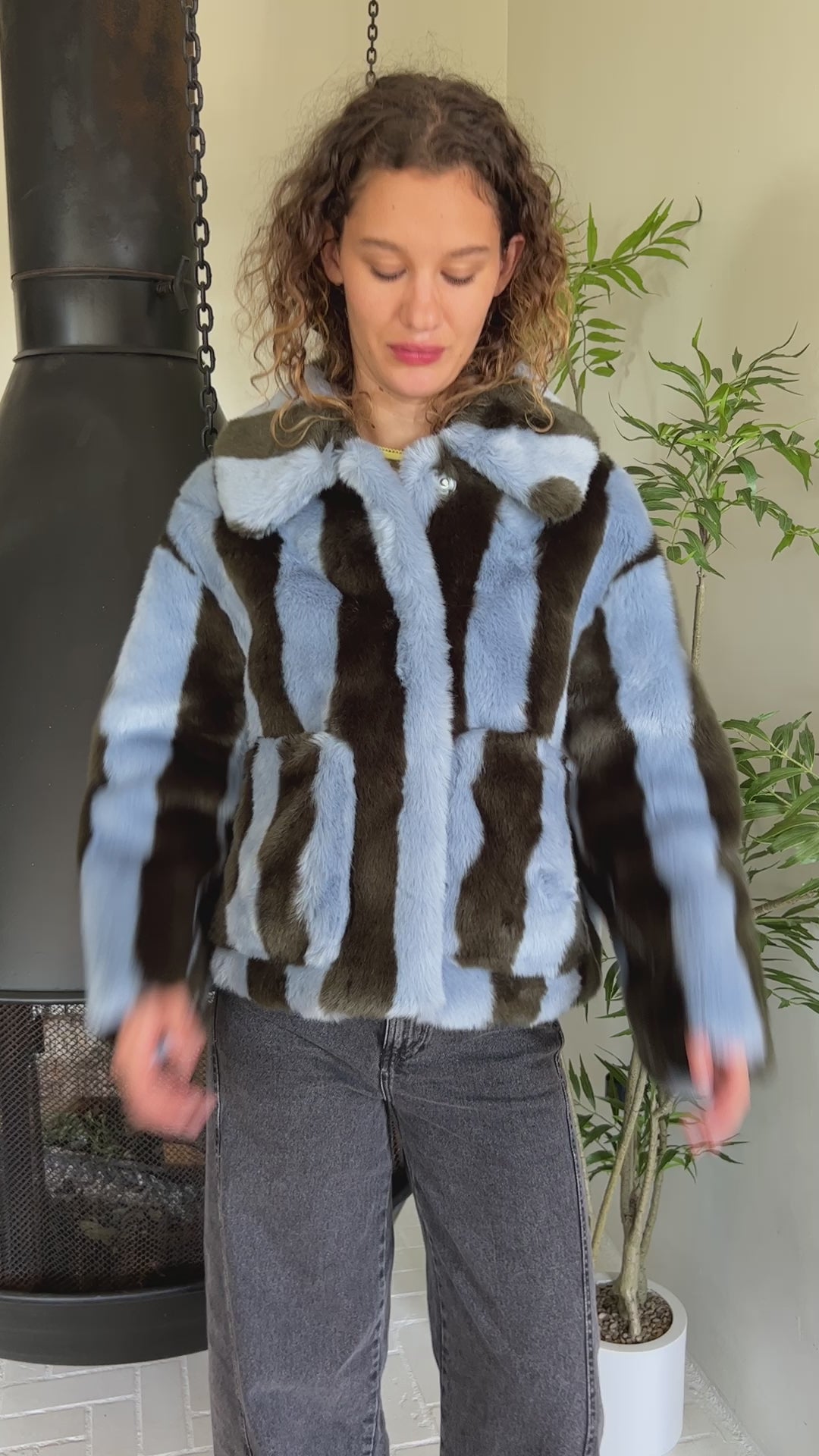 Realistic faux fur jacket made from plastic bottles, designed in a roomy cut for versatility and layering featured in a fun blue and green stripe pattern. Pop button closure at front and lined patch pockets.