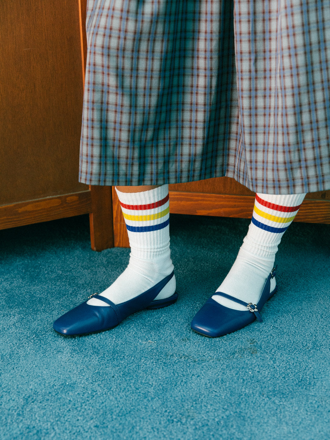 A flat slingback mary jane style shoe with a square toe and an adjustable ankle strap with a comfortable elastic band.