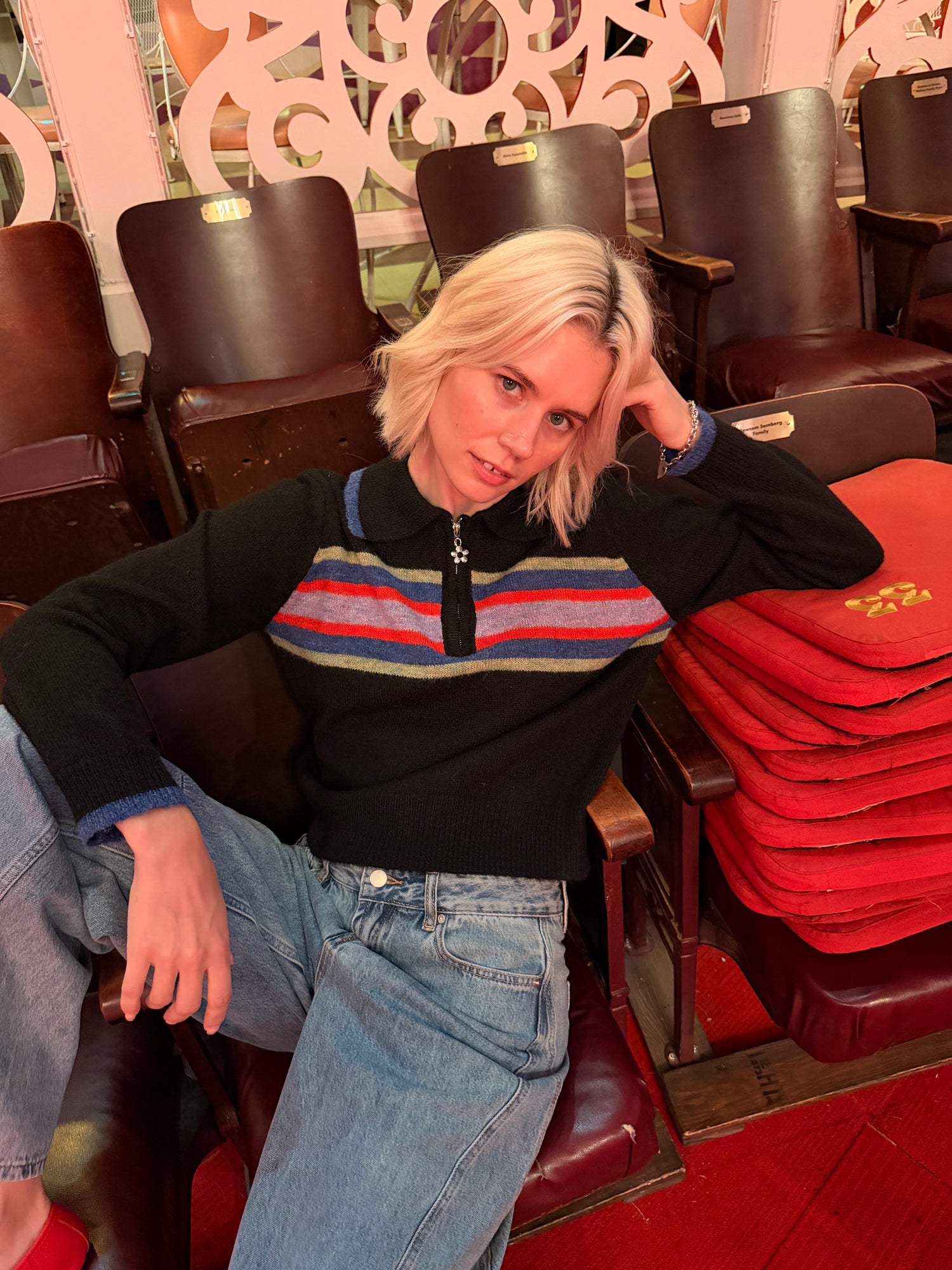 Introducing the Wylie Half Zip Sweater: This cropped wool blend half zip sweater is featured in an athletic stripe with our signature florette zipper, and a collar. The ribbed trim on the sleeves and bottom hem offers stretch and comfortability.